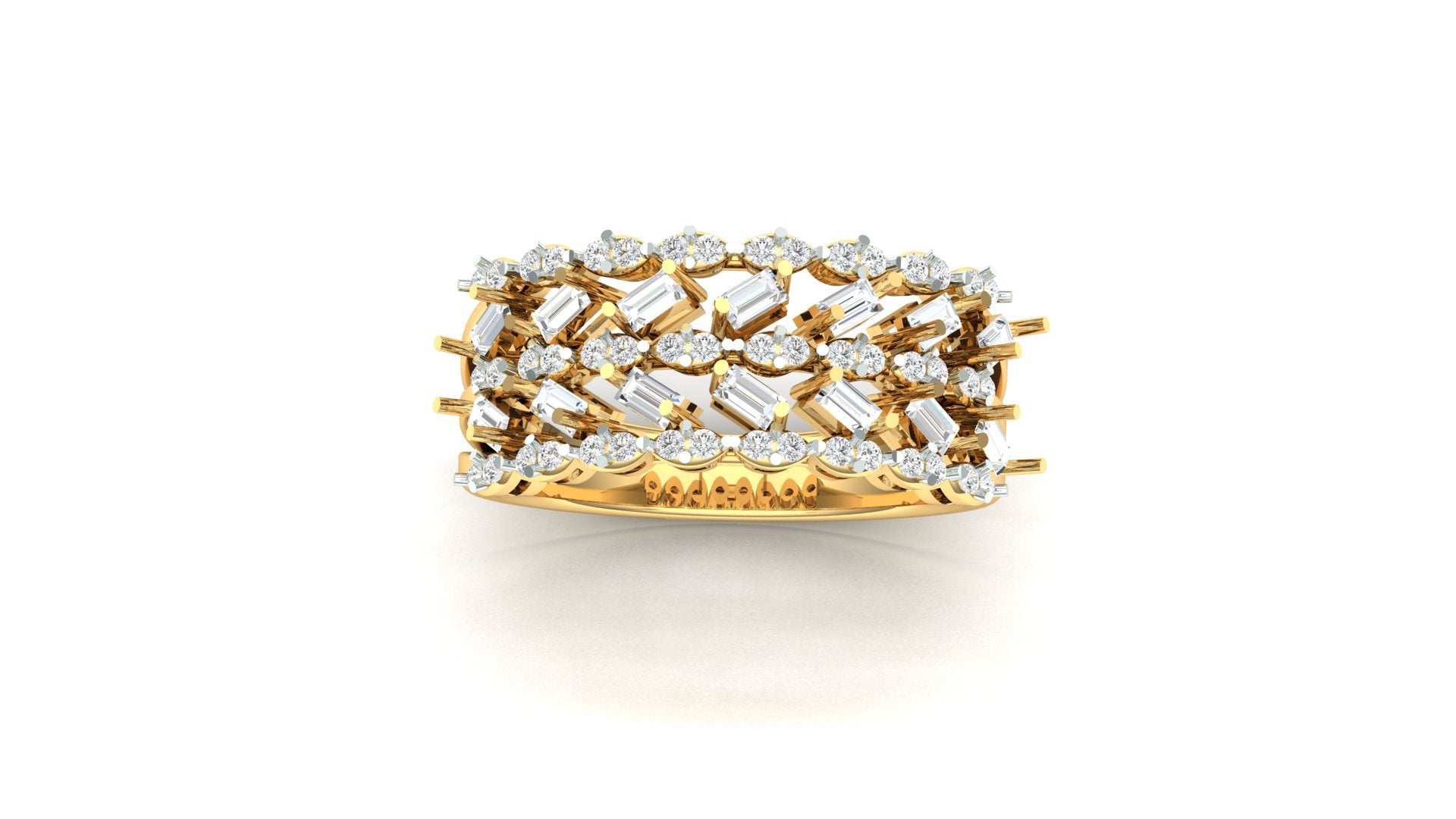 The design utilizes prong and cluster settings (inferred), with large marquise or pear-shaped stones (inferred by the clusters) set in white metal accents that dramatically contrast with the highly polished yellow gold band. The wide coverage and numerous stones ensure continuous, vibrant brilliance across the entire top surface of the ring.