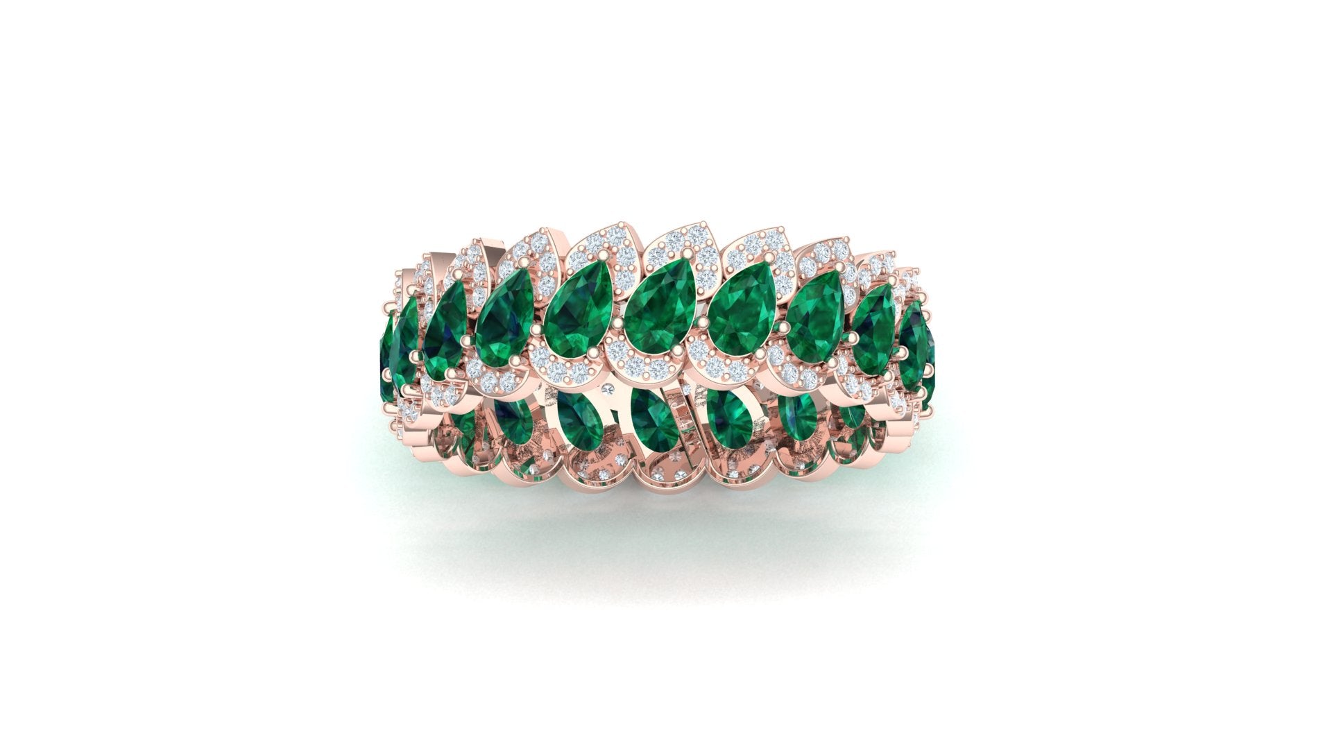 The emeralds are beautifully contrasted and highlighted by a multitude of diamonds, totaling 168 pieces with a combined weight of 0.32 Ct. The combination of the deep green emeralds and the brilliant diamonds creates a floral cluster appearance that is both colorful and dazzling.