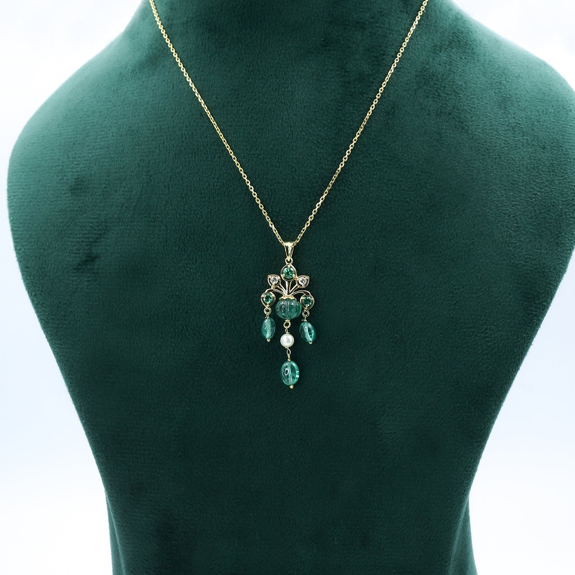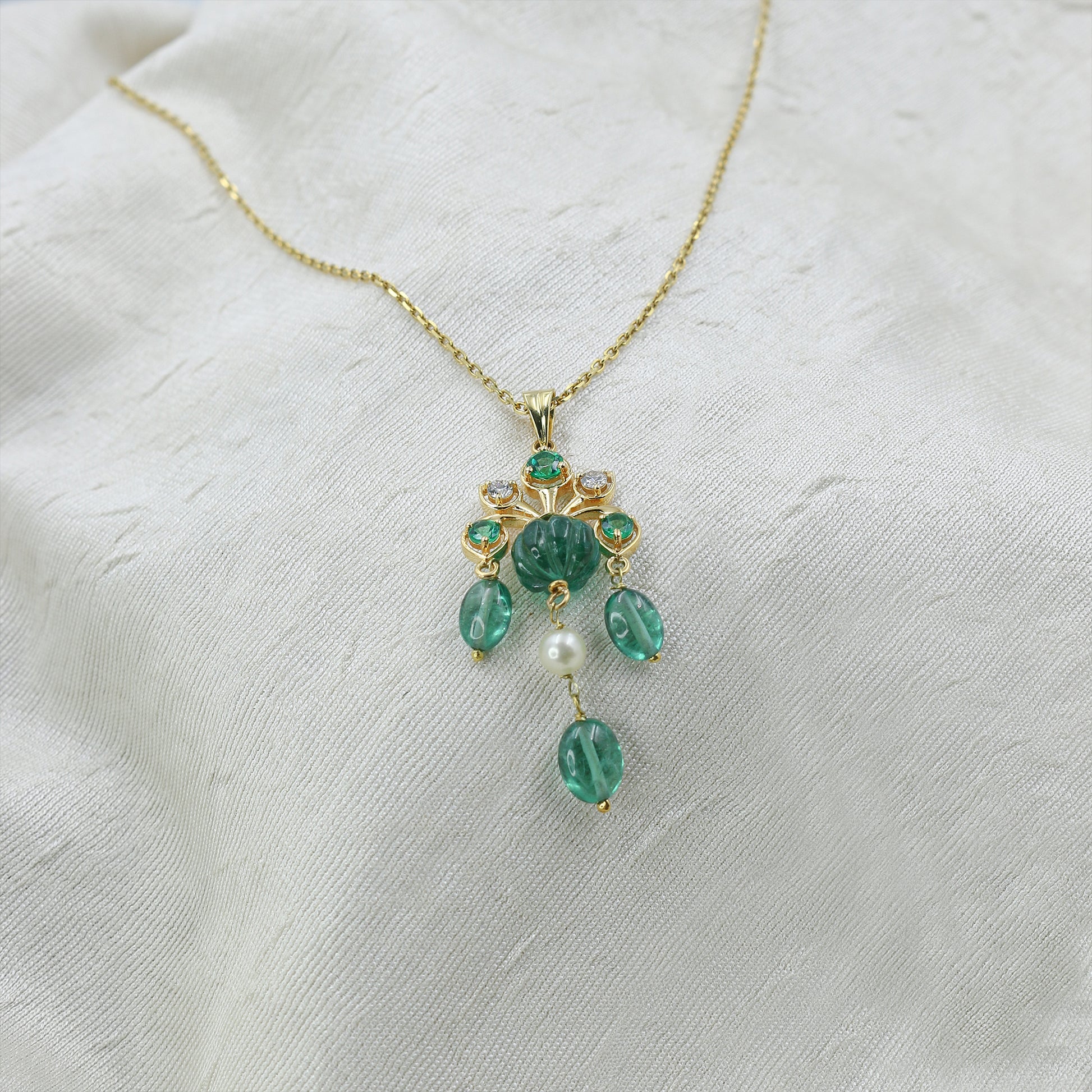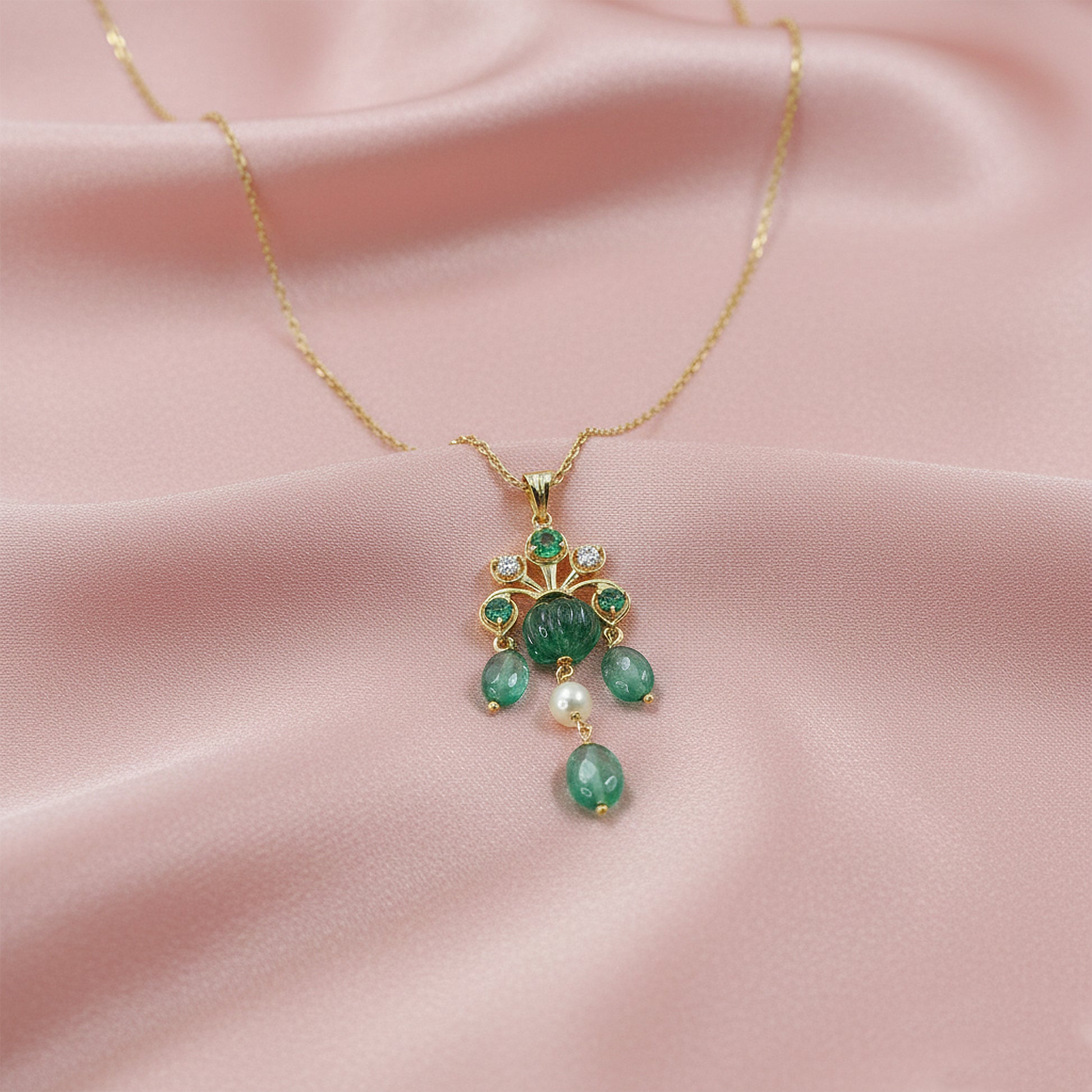Introducing the vibrant Yellow Gold Hydro Gemstone Cluster Pendant with Chain - AJ60687. This necklace features a bold, organic cluster of 7 Hydro gemstones, offering an intense green color and an impressive total weight of 8.48 Ct. The stones are accented by 2 small, IJ-VVS1 diamonds (0.15 Ct total) for a hint of brilliance.