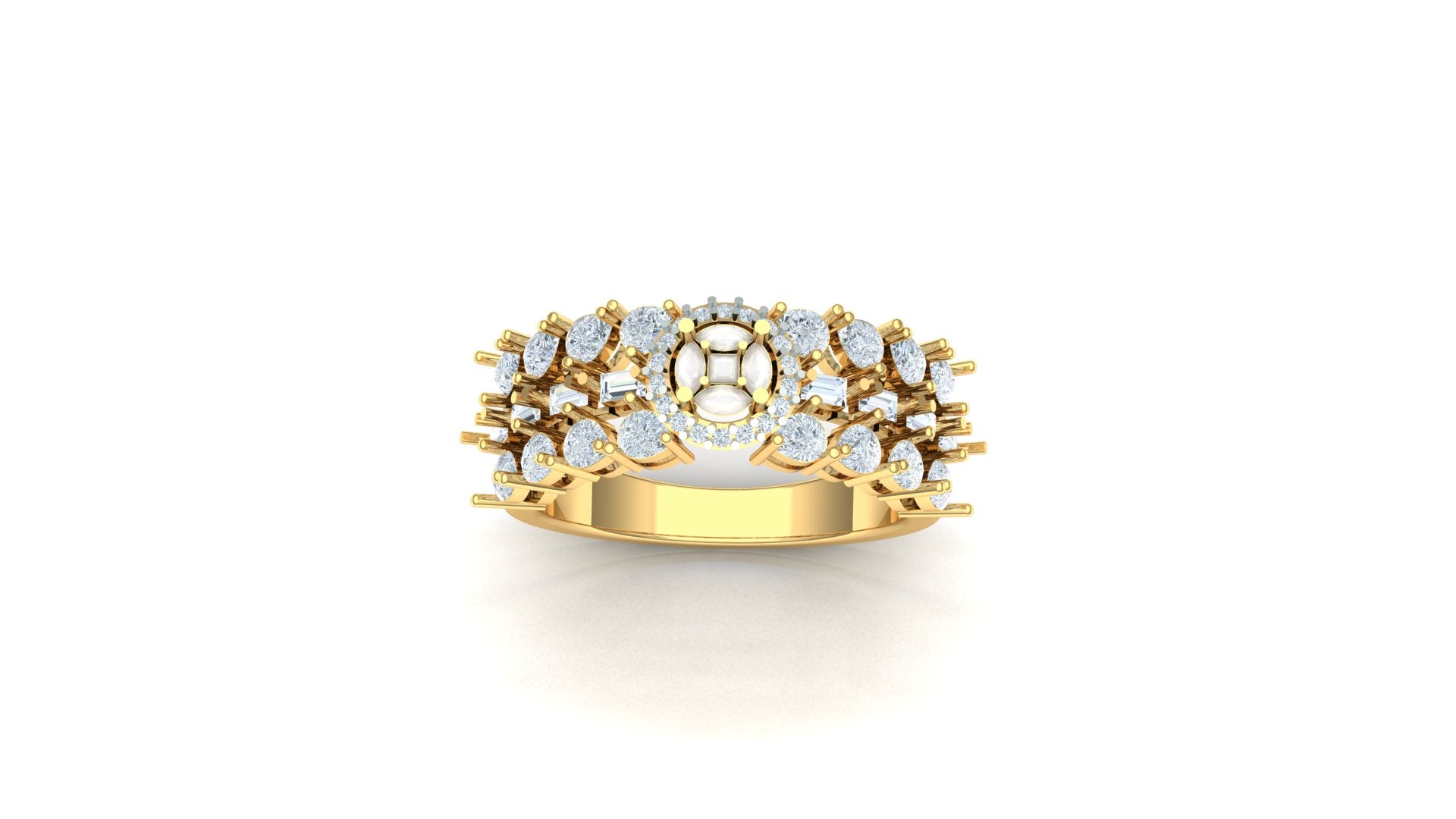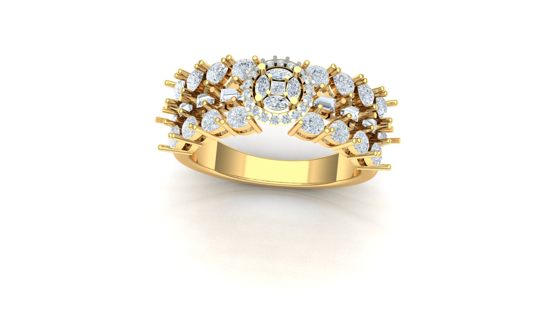Introducing the breathtaking and voluminous Tiered Leaf Cluster CVD Diamond Ring - ST-2480. This spectacular piece features a wide, multi-layered gallery that bursts with diamond-set elements, meticulously arranged to resemble delicate leaves or floral accents. The ring is generously set with forty-seven individual CVD diamonds, achieving a high total weight of 1.59 Ct.