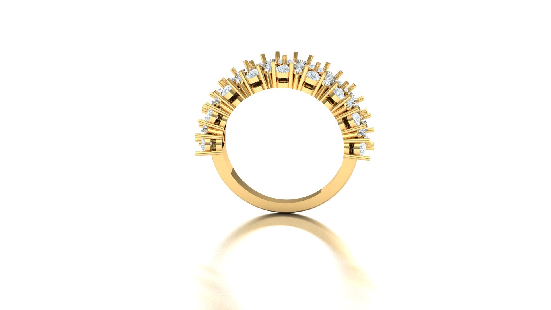 The diamonds are set in multiple alternating clusters (inferred: likely round and marquise cuts) within white metal (inferred) settings, which maximizes sparkle and contrasts beautifully with the polished yellow gold band. The overall effect is a dense, high-coverage look that is perfect as a statement piece or anniversary band.