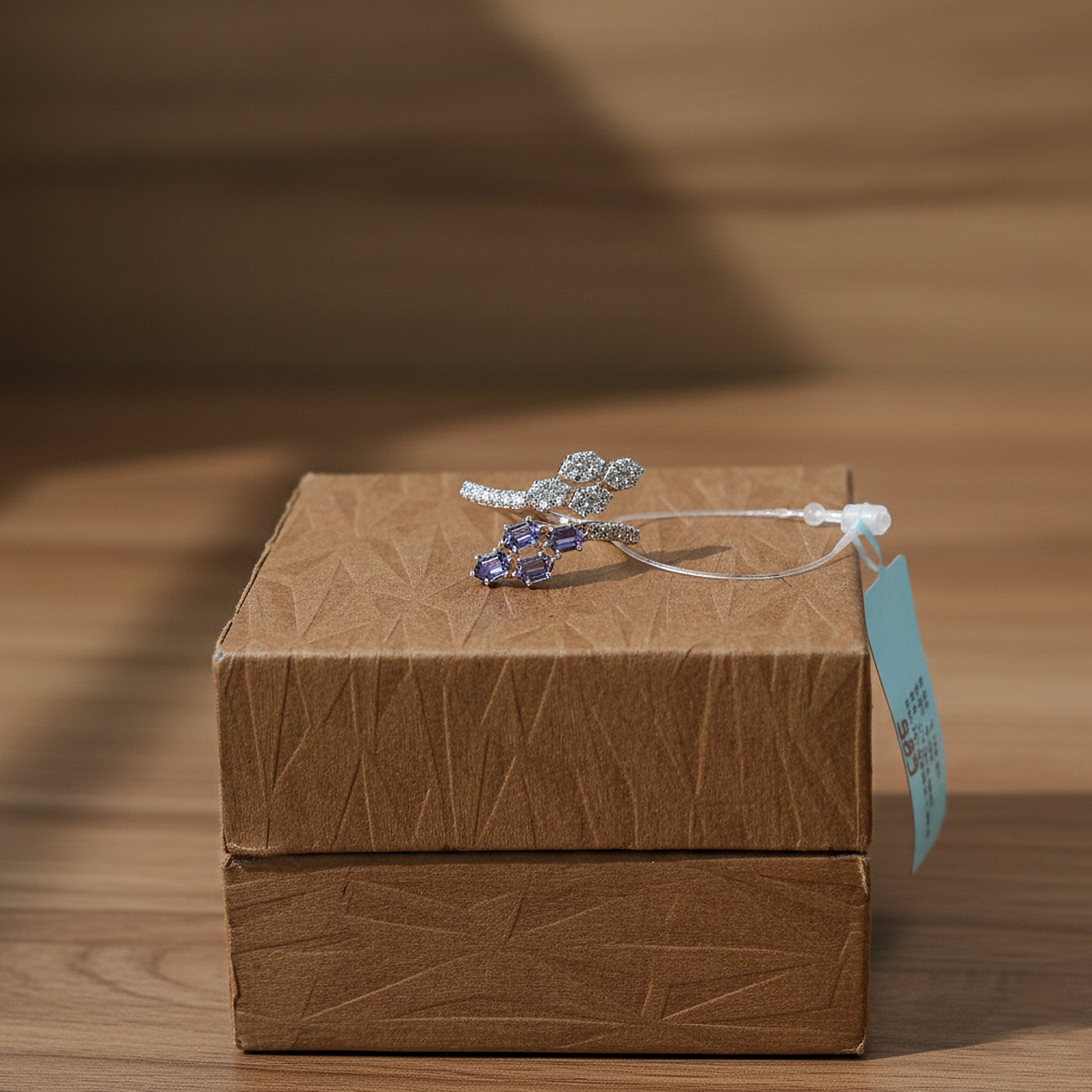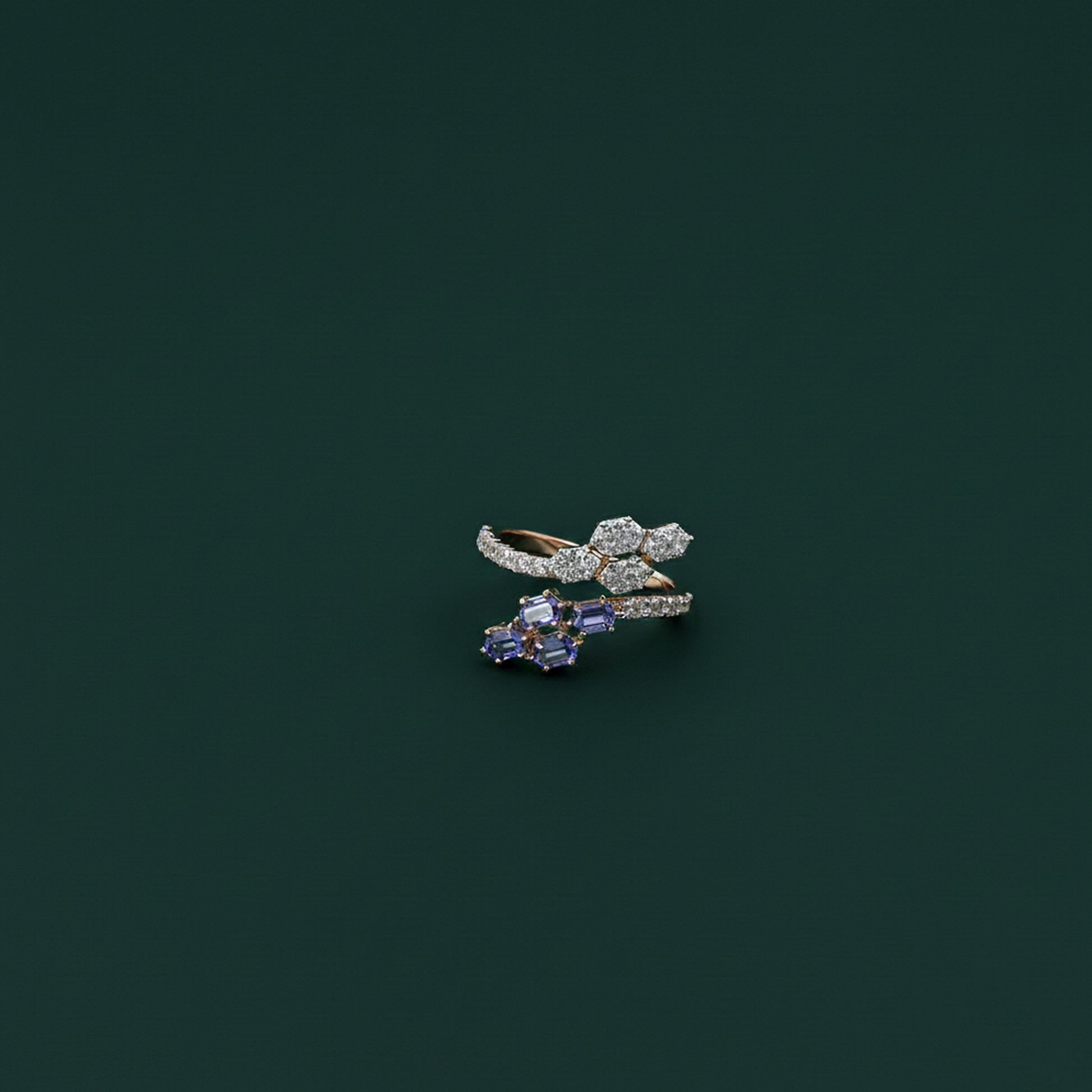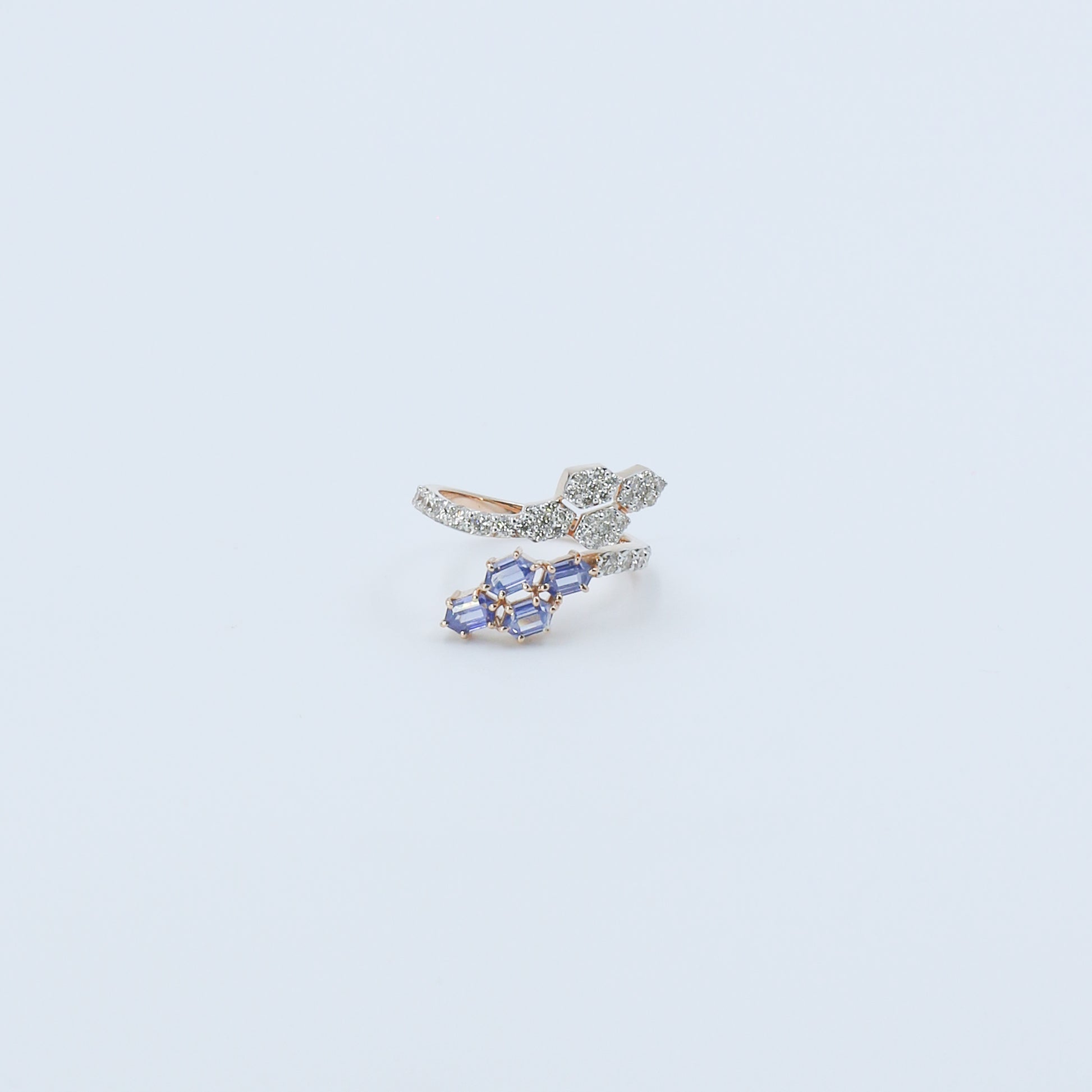 Redefine contemporary luxury with the Diamond & Blue Colorstone Hexagonal Bypass Ring - AJ12027. This striking "ring" features a sophisticated bypass silhouette that artfully wraps the finger with two distinct geometric clusters. One end of the bypass showcases a radiant trio of hexagonal diamond-set motifs, while the opposing end features a vibrant cluster of four blue colorstones totaling 1.3 carats. This interplay of icy diamond brilliance and serene blue tones creates a dynamic, high-fashion aesthetic.