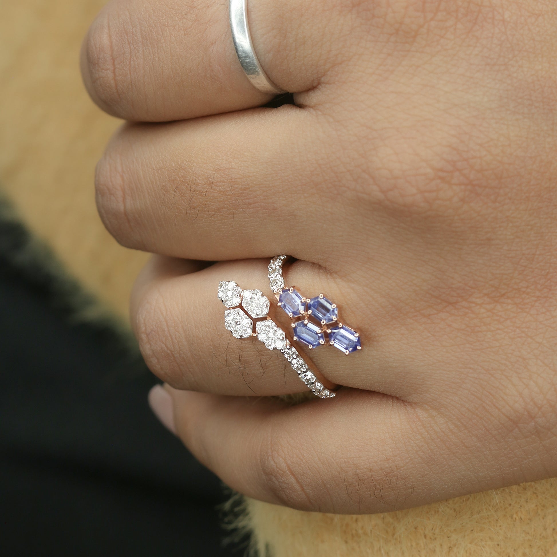 Diamond & Blue Colorstone Hexagonal Bypass Ring