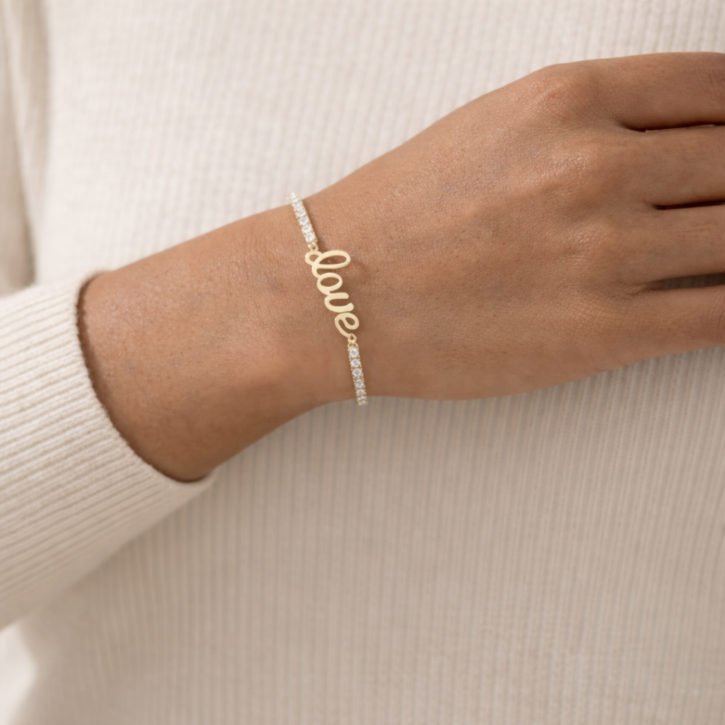 The Diamond "Love" Script Tennis Bracelet - AJ-BR-15 is a beautiful fusion of classic jewelry design and sentimental expression. This elegant bracelet features a continuous line of shimmering diamonds that meet at a central, gold-script "love" motif. The fluid design ensures that the bracelet rests comfortably against the wrist, making it an ideal piece for both special occasions and daily wear.