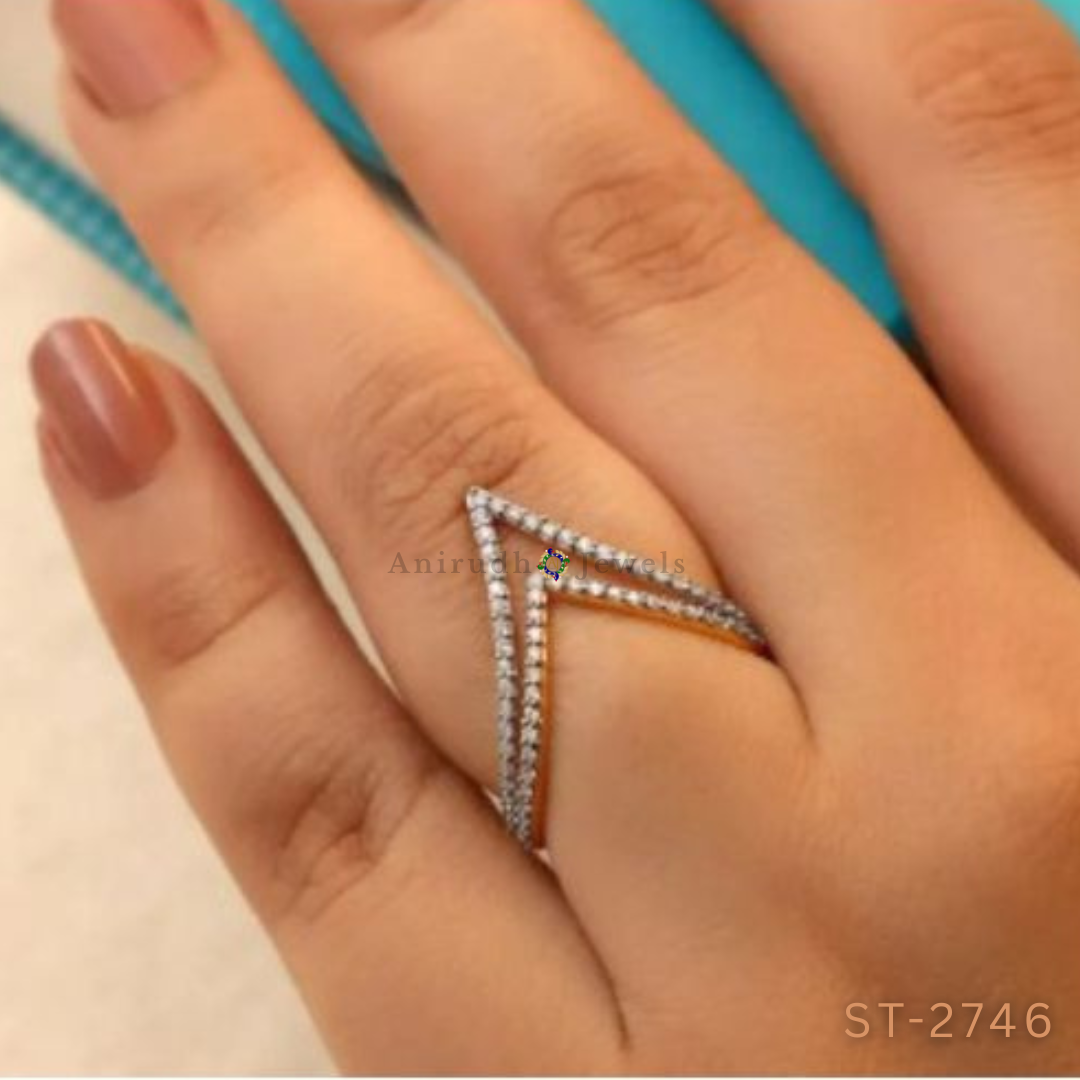Elevate your collection with the Double Layered Chevron Diamond Ring by Anirudh Jewels. Handcrafted in warm rose gold, this stunning ring features two sleek V-shaped bands pavé-set with sparkling round diamonds, blending modern style with timeless elegance. Perfect for stacking or wearing solo, its chevron design symbolizes good luck and forward movement. Crafted with the finest finishing by one of Jaipur’s top-rated diamond jewelry manufacturers and offered direct from factory, this ring delivers luxurious quality at an affordable price—ideal for showrooms seeking standout pieces trusted for exceptional craftsmanship and value.