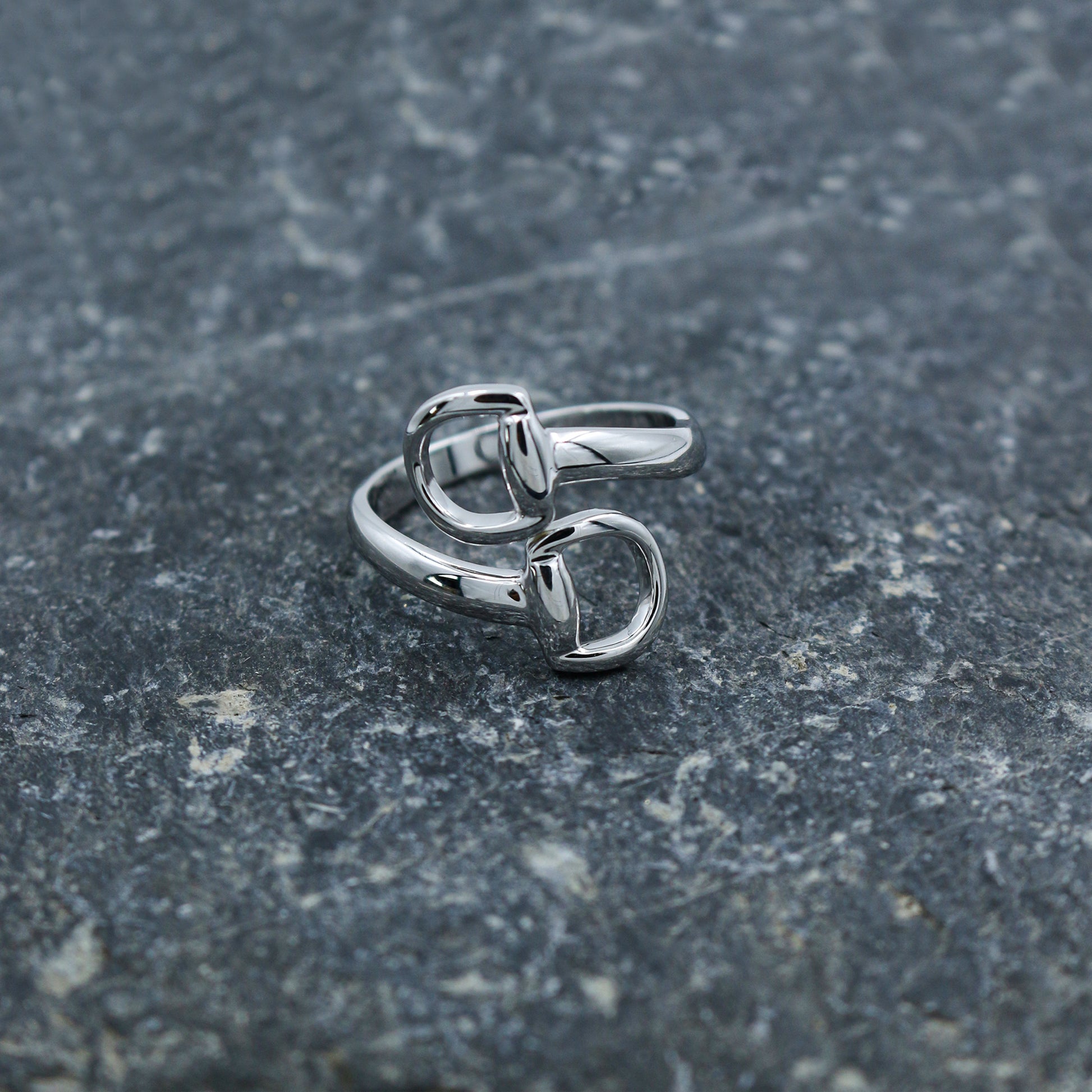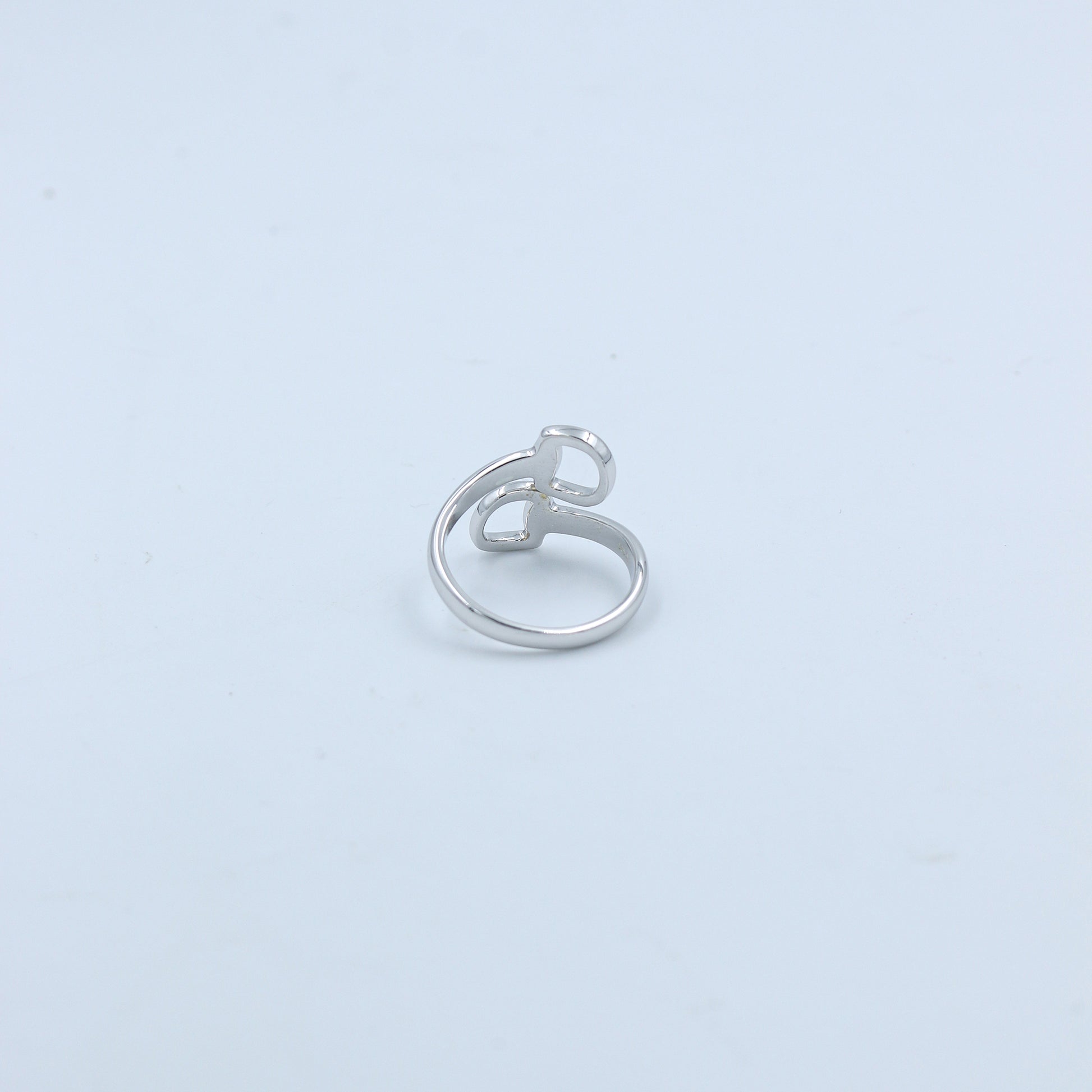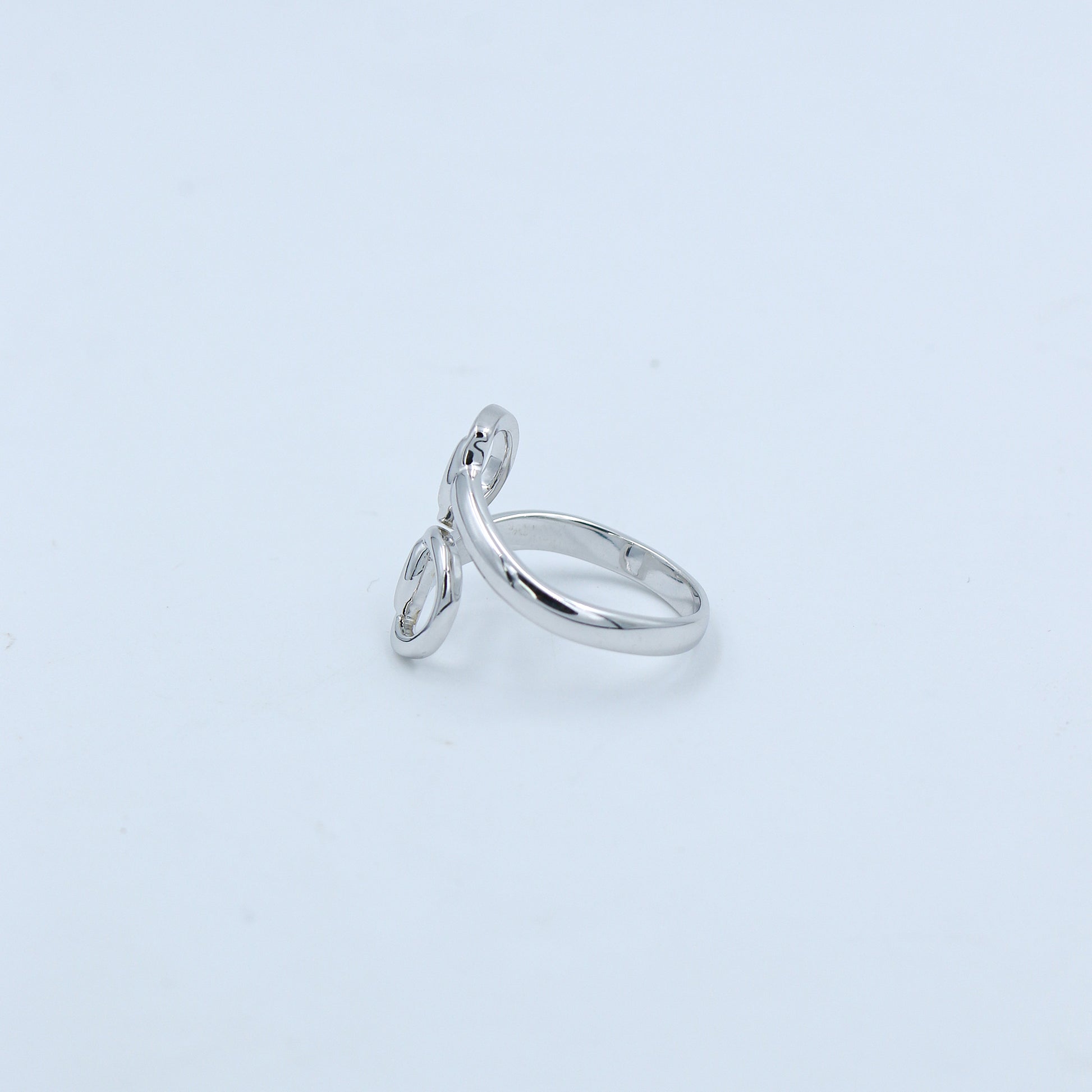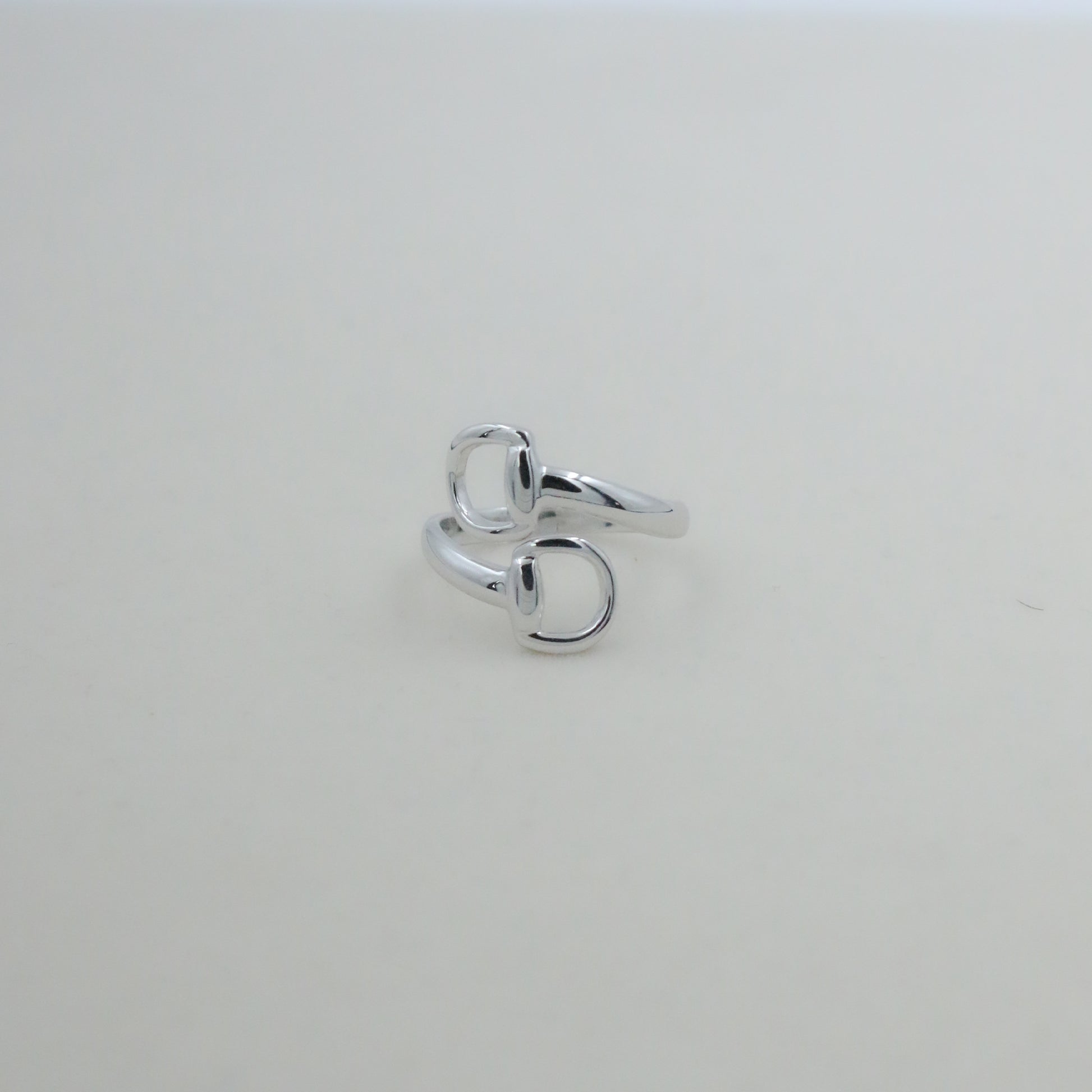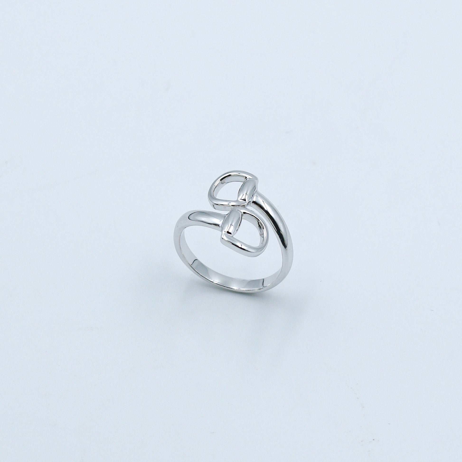 Embrace a touch of high-fashion heritage with the Equestrian-Inspired Polished White Gold Ring - AJ12040. This striking ring features a contemporary bypass silhouette inspired by the classic lines of traditional horse bits. The fluid, sculptural design wraps the finger with two bold, polished D-rings that meet in a seamless overlap, creating a sophisticated and architectural aesthetic.