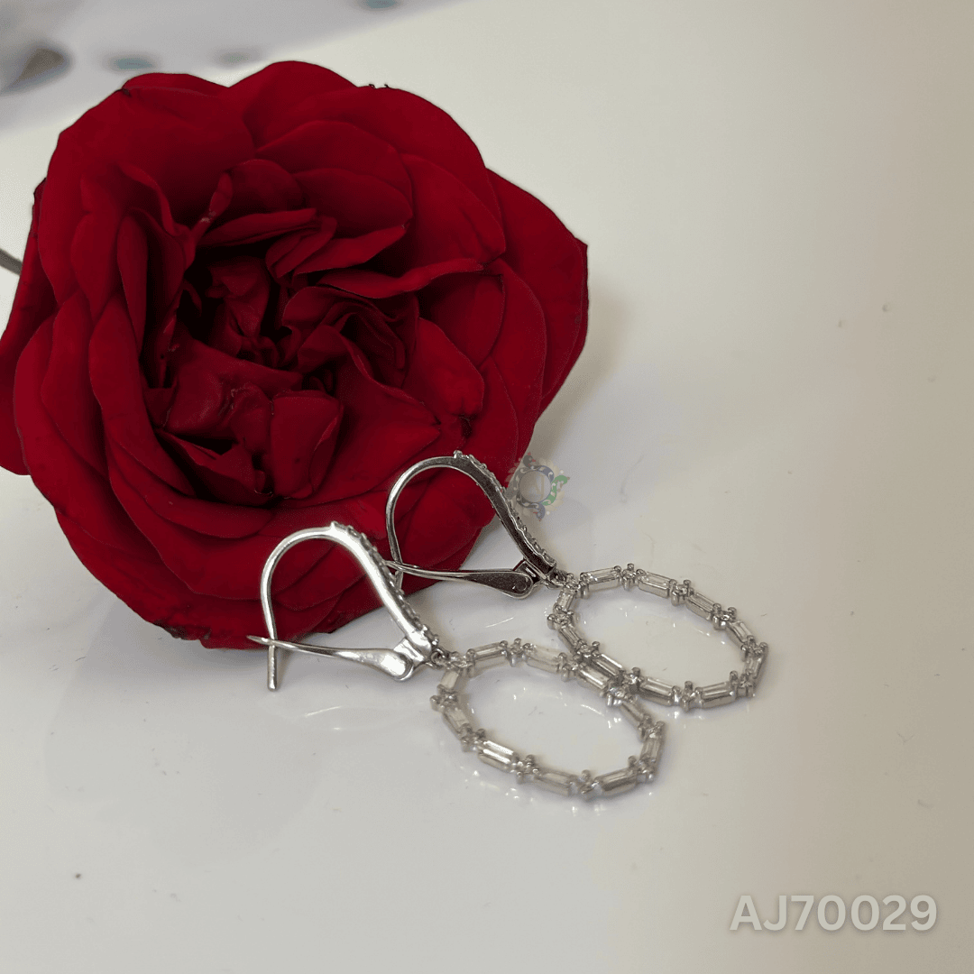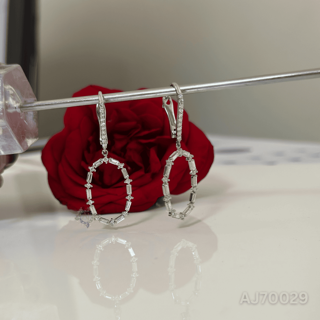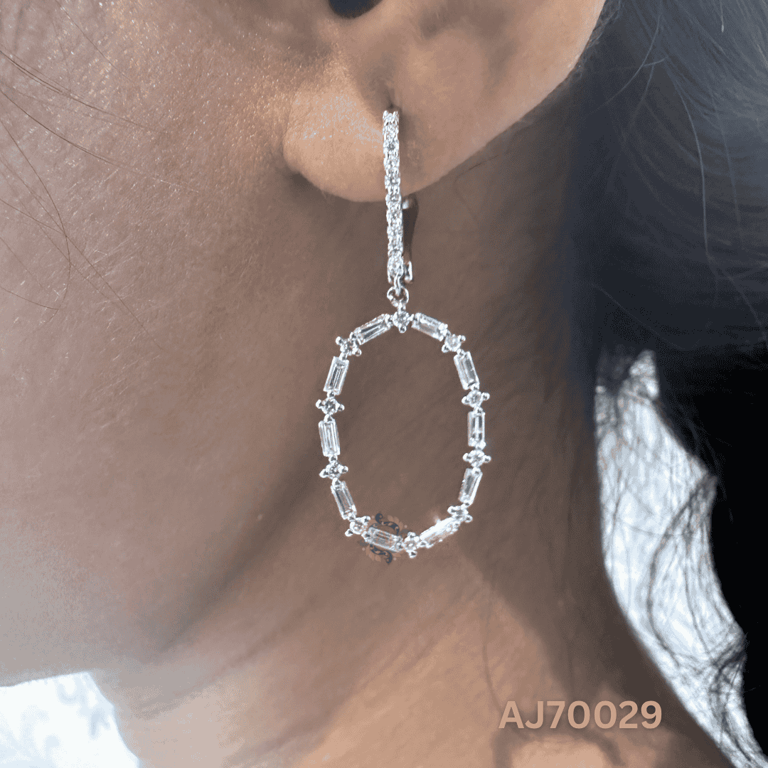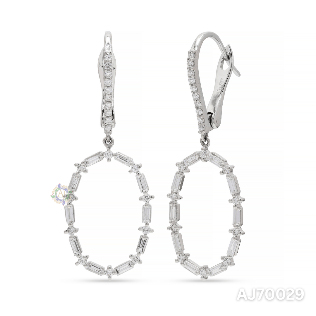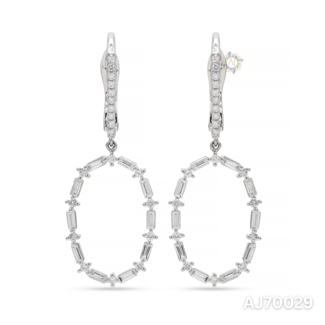 Add refined brilliance to your look with the Oval Radiance Baguette Earrings by Anirudh Jewels. These statement drops feature a graceful oval silhouette formed by alternating baguette and round-cut diamonds, suspended from a sleek diamond-studded huggie top. Their timeless sparkle and fluid movement make them perfect for elevating both day and evening ensembles. Handcrafted with attention to detail and customizable to your style.