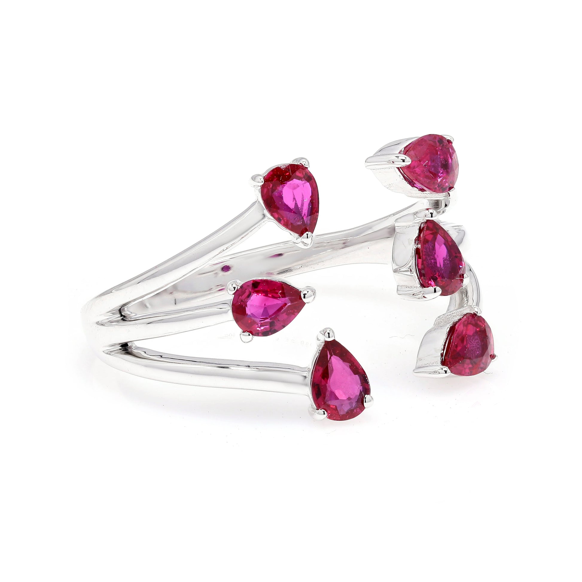 Radiating elegance and passion, the Six Stone Ruby Open Wrap Ring is a modern statement of timeless beauty. Crafted in 14k gold, this captivating design features six vivid pear-cut rubies gracefully set along an open wrap band, symbolizing love, strength, and vitality. The sleek open-ended silhouette offers a contemporary twist, making it perfect for everyday wear or special occasions. Whether worn solo or stacked with other rings, this ruby ring adds a touch of bold sophistication to any look.