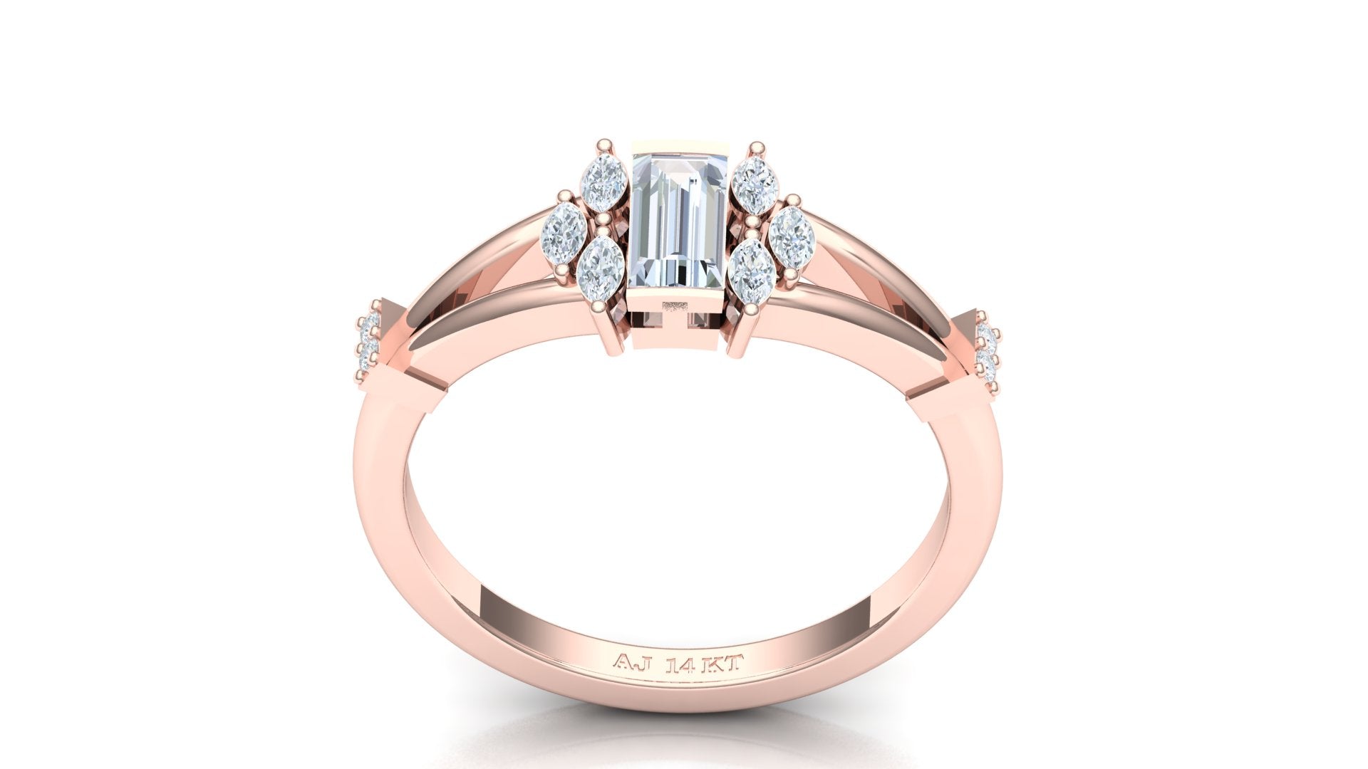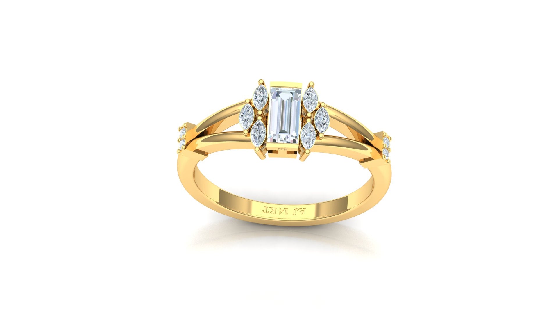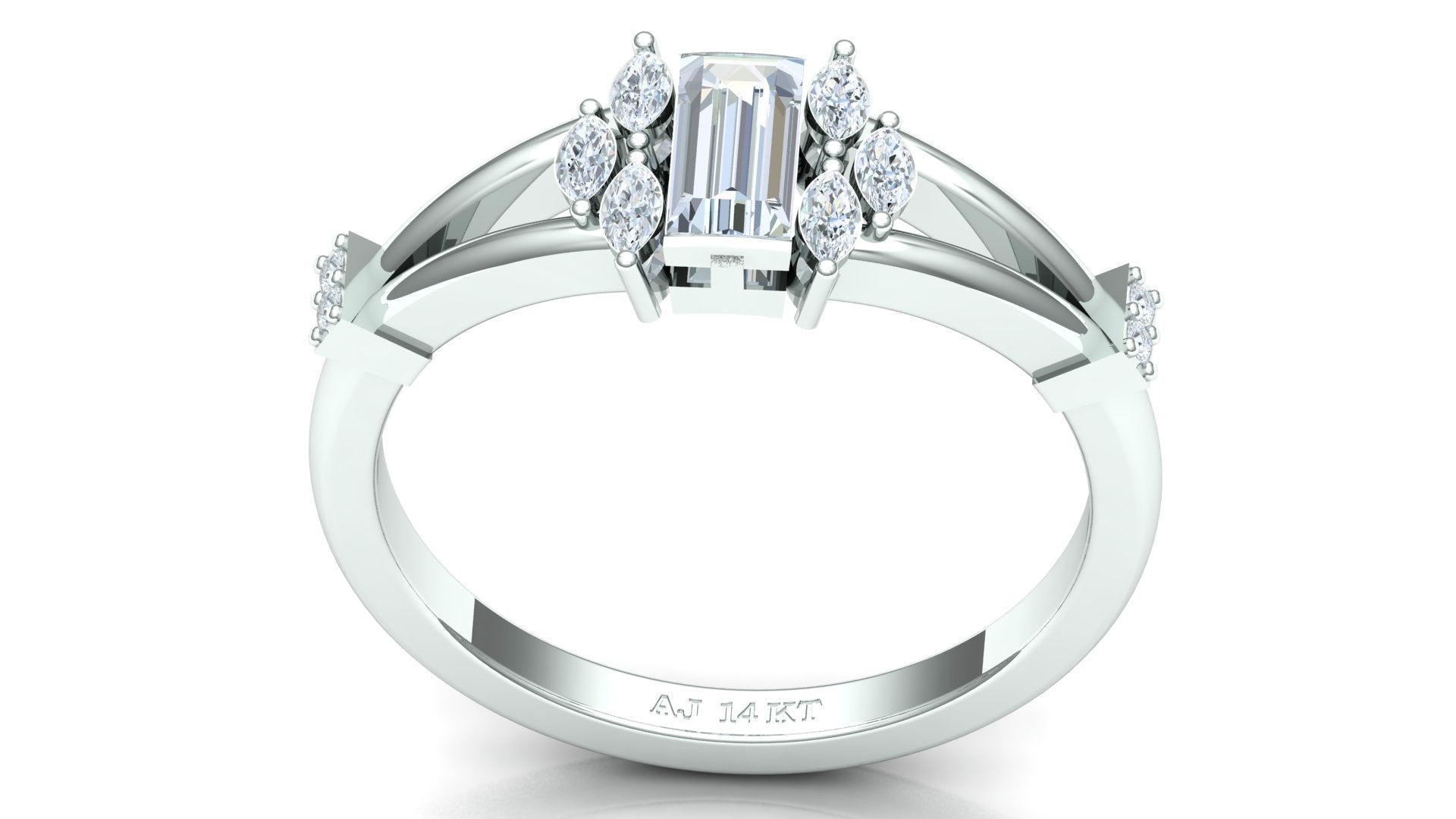 Diamond Type: Emerald Cut (Inferred for center stone) and Round/Baguette (Inferred for accents)