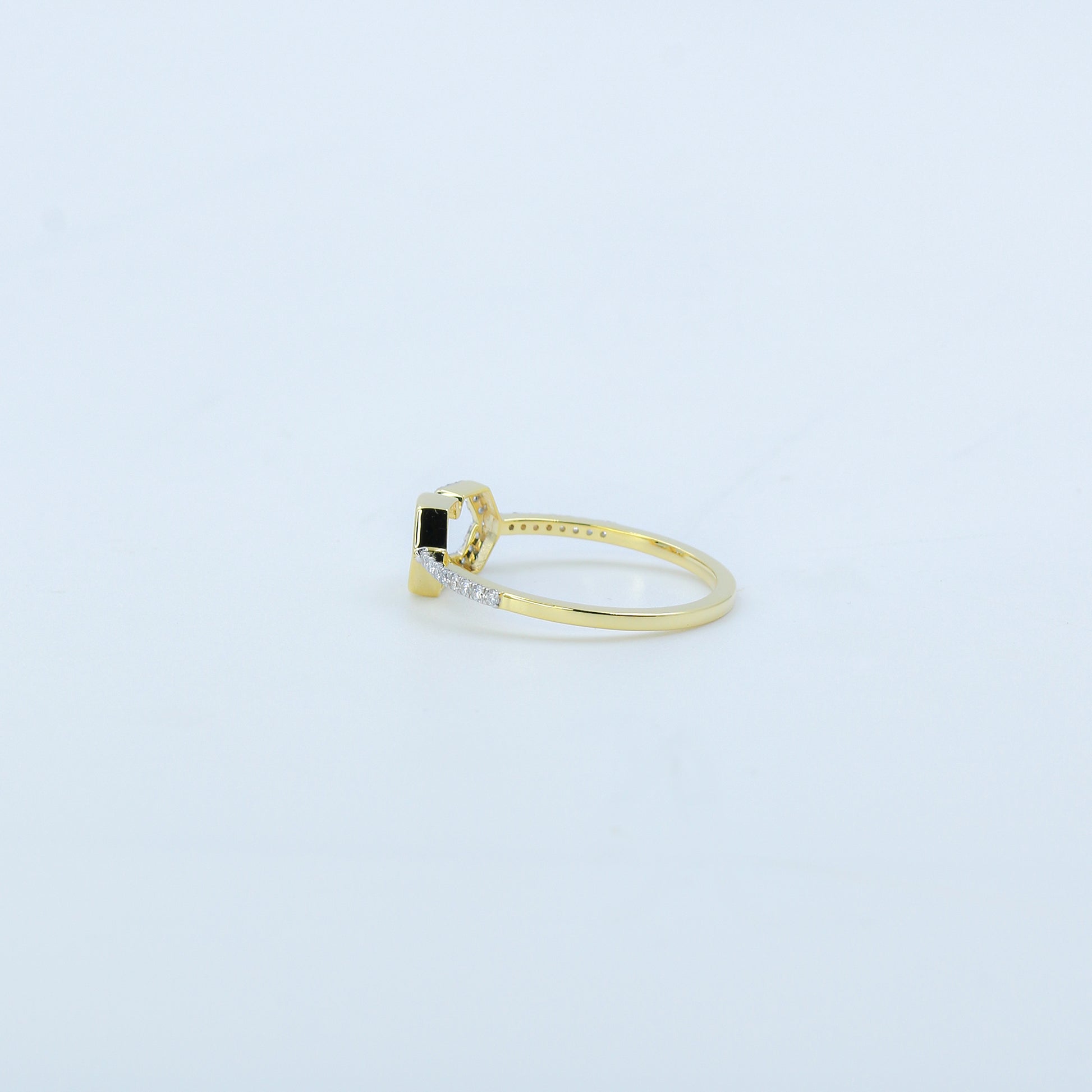 Discover modern minimalism with the Two-Tone Hexagon Interlocking Diamond Ring - AJ61212. This contemporary piece features two interlocking hexagonal shapes at its center, creating a unique geometric focal point. One hexagon is finished in polished yellow gold (inferred), while the other is adorned with shimmering diamonds, creating a stylish two-tone contrast.