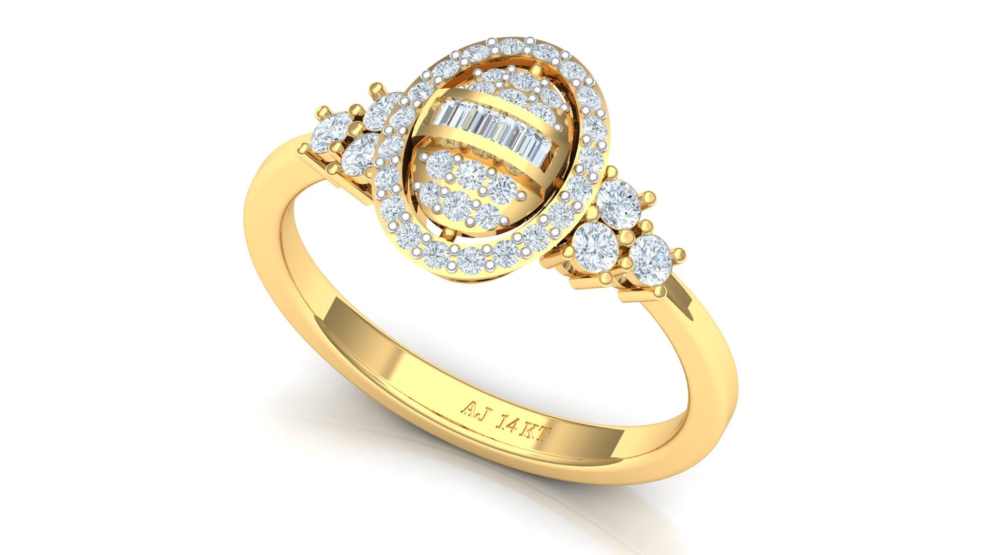 Introducing the eye-catching and distinctive Two-Tone Oval Sunburst Pave Diamond Ring - ST-2398. This ring features a sleek yellow gold band leading to a unique, multi-layered centerpiece. The focal point is a central open oval (inferred: white metal) framed by diamond-paved layers and accented by radiating diamond clusters on the sides, creating a sunburst or compass effect.