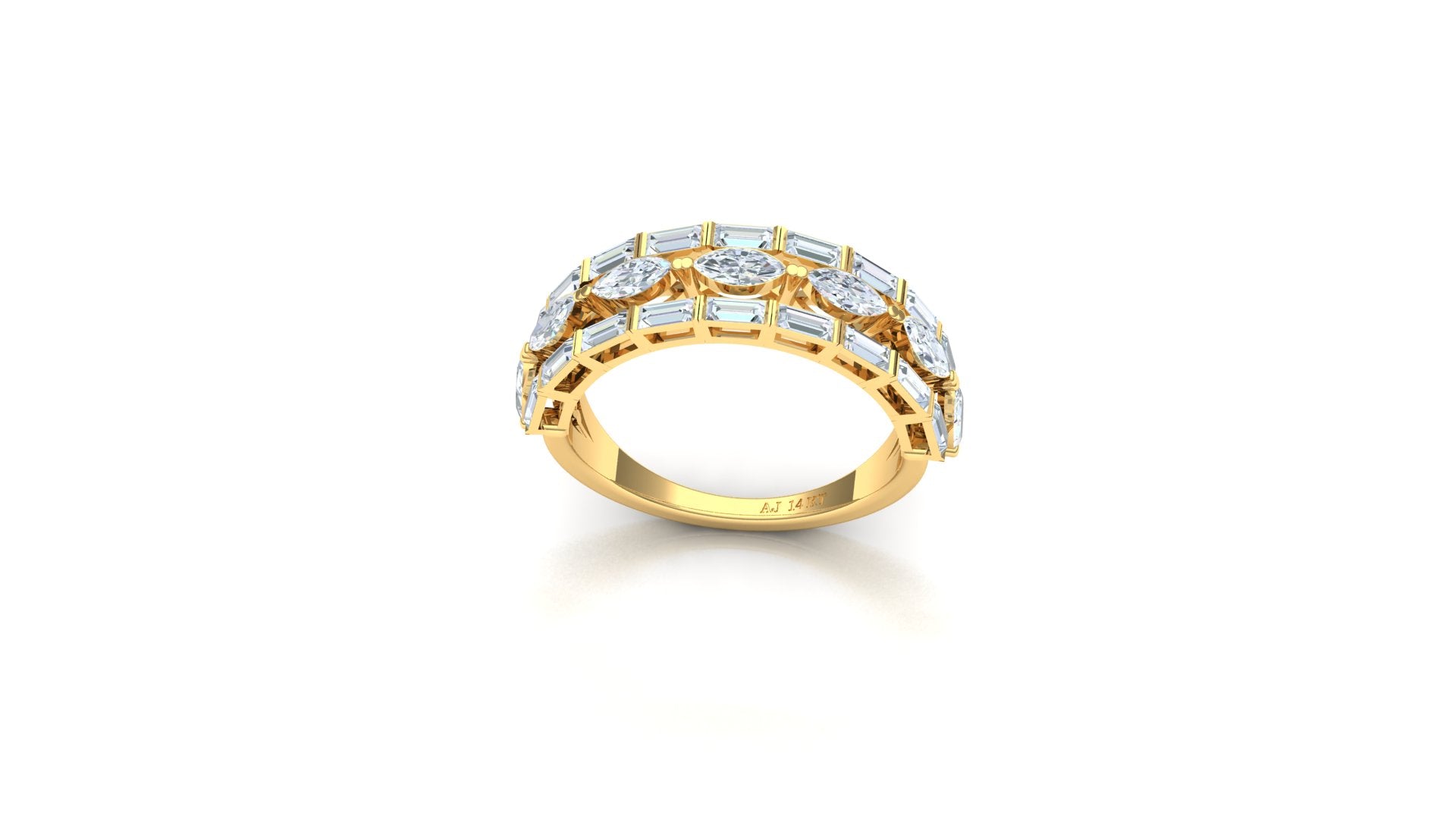 The design showcases a wide, architectural surface where white metal elements (inferred) create a geometric, staggered pattern against the polished yellow gold band (inferred). This intricate lattice setting maximizes the impact of the numerous diamonds, ensuring brilliance from every angle. The ring weighs 3.4 grams and is sized at US 7.
