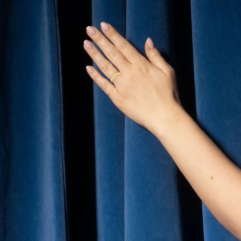 The subtle design is enhanced by three small, carefully set diamonds, providing a gentle sparkle (0.06 Ct total weight). The diamonds are of GH-VVS1 clarity and color. Crafted in warm yellow gold (inferred), the ring has a comfortable gross weight of 2.5 grams, making the AJ-RG-27 perfect as an everyday accessory or a unique wedding band.