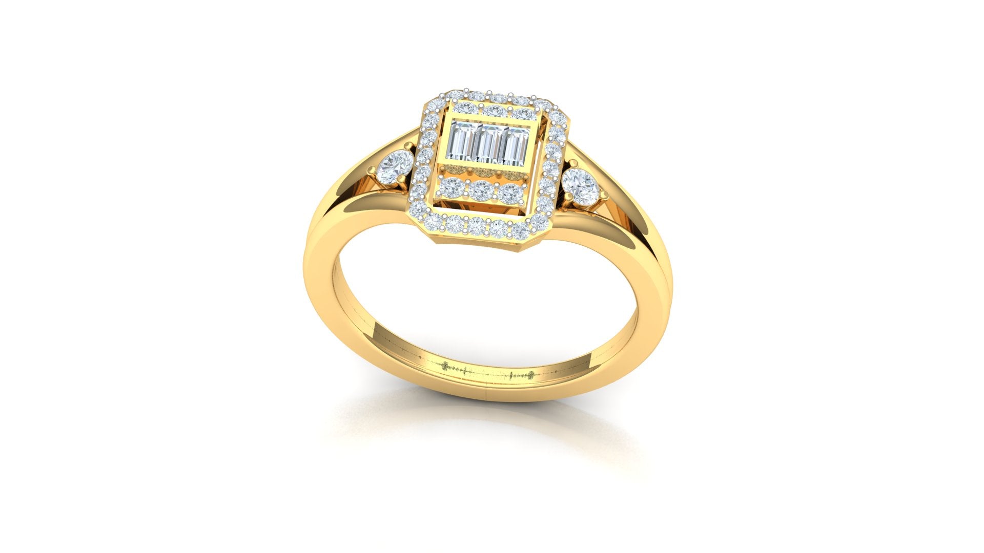 Introducing the magnificent Yellow Gold Geometric Halo Diamond Statement Ring - ST-2424. This luxurious piece demands attention with its bold, multi-faceted head. The centerpiece features a clustered rectangular shape (inferred) surrounded by a dazzling round diamond halo. The overall white metal setting (inferred) maximizes the brilliance of the stones, creating a massive, single-stone look.