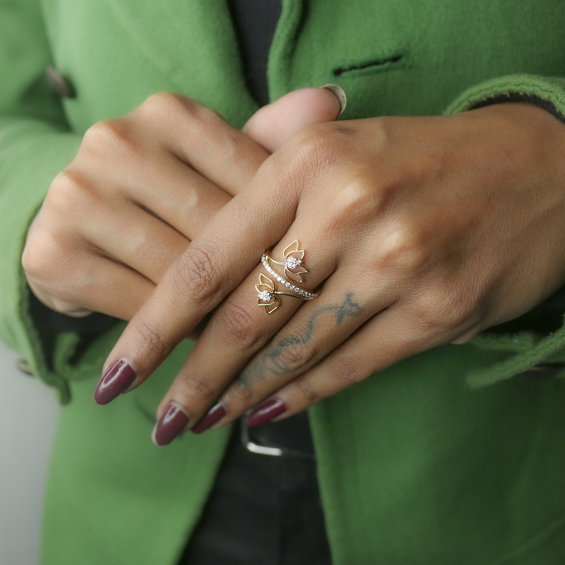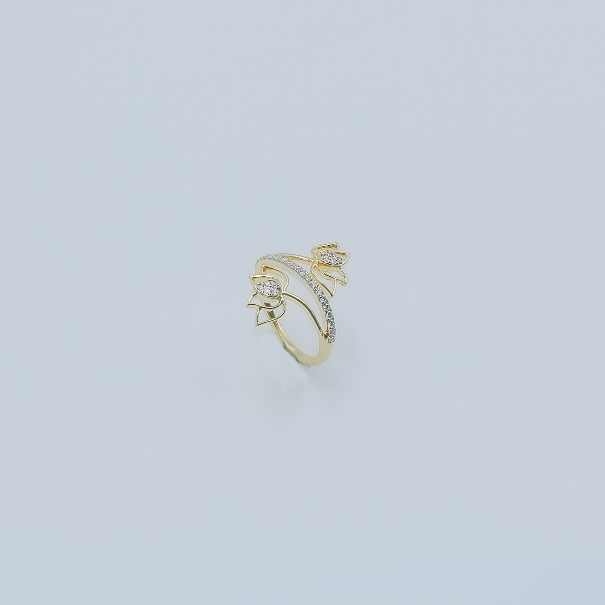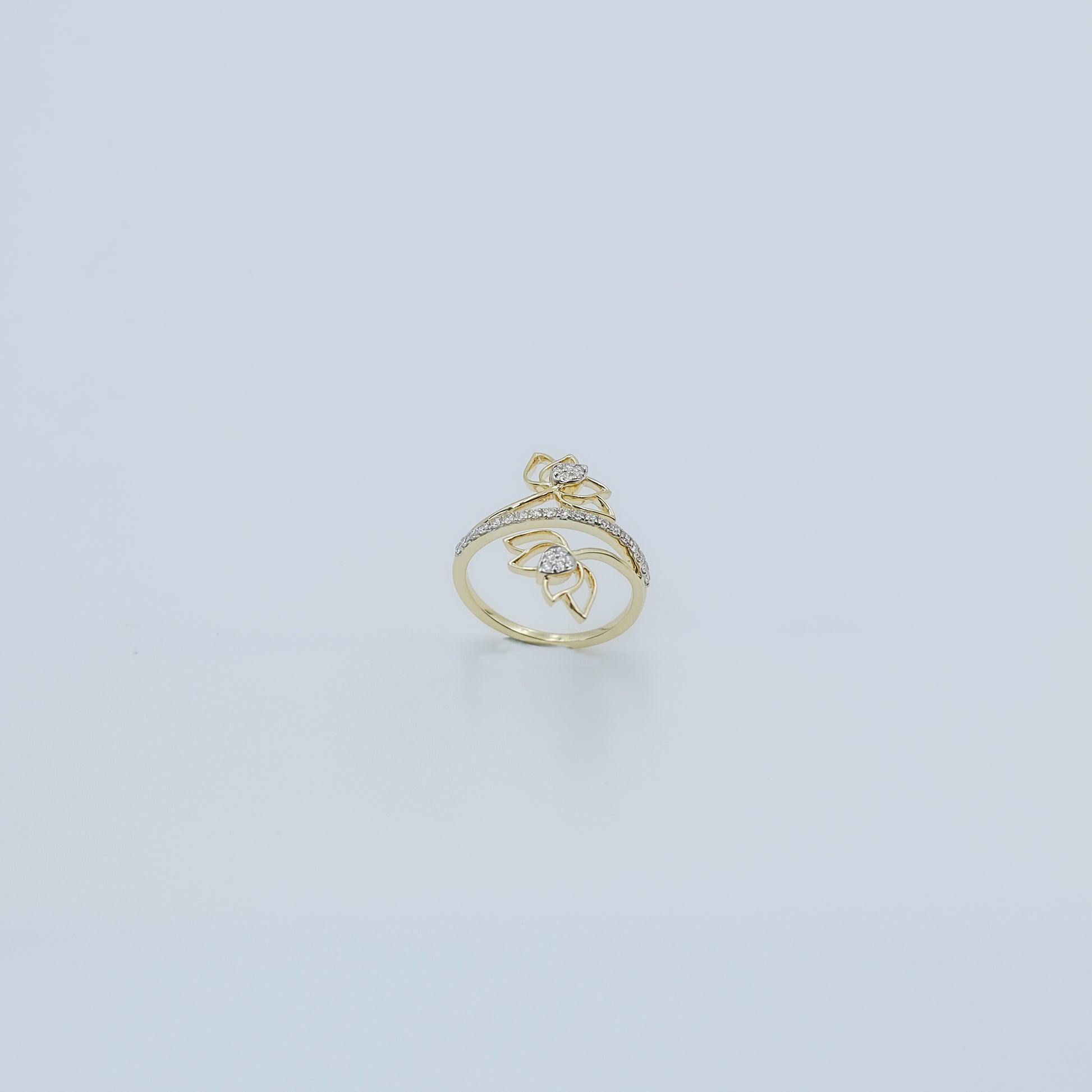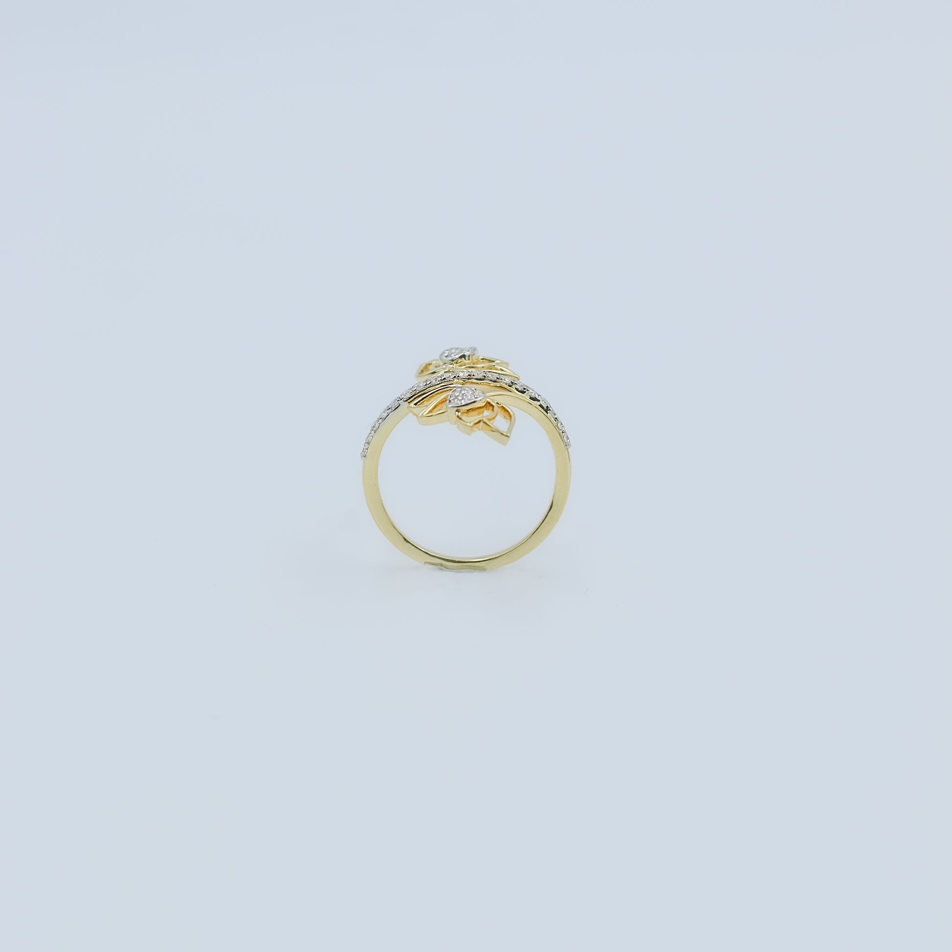 Introducing the dynamic Yellow Gold Multi-Hoop Pave Diamond Ring - AJ61170. This distinctive ring captures attention with its sculptural, layered design, reminiscent of overlapping hoops or swirling ribbons. The curves of the ring are beautifully highlighted by a total of 23 pave-set diamonds, combining for 0.26 Ct.
