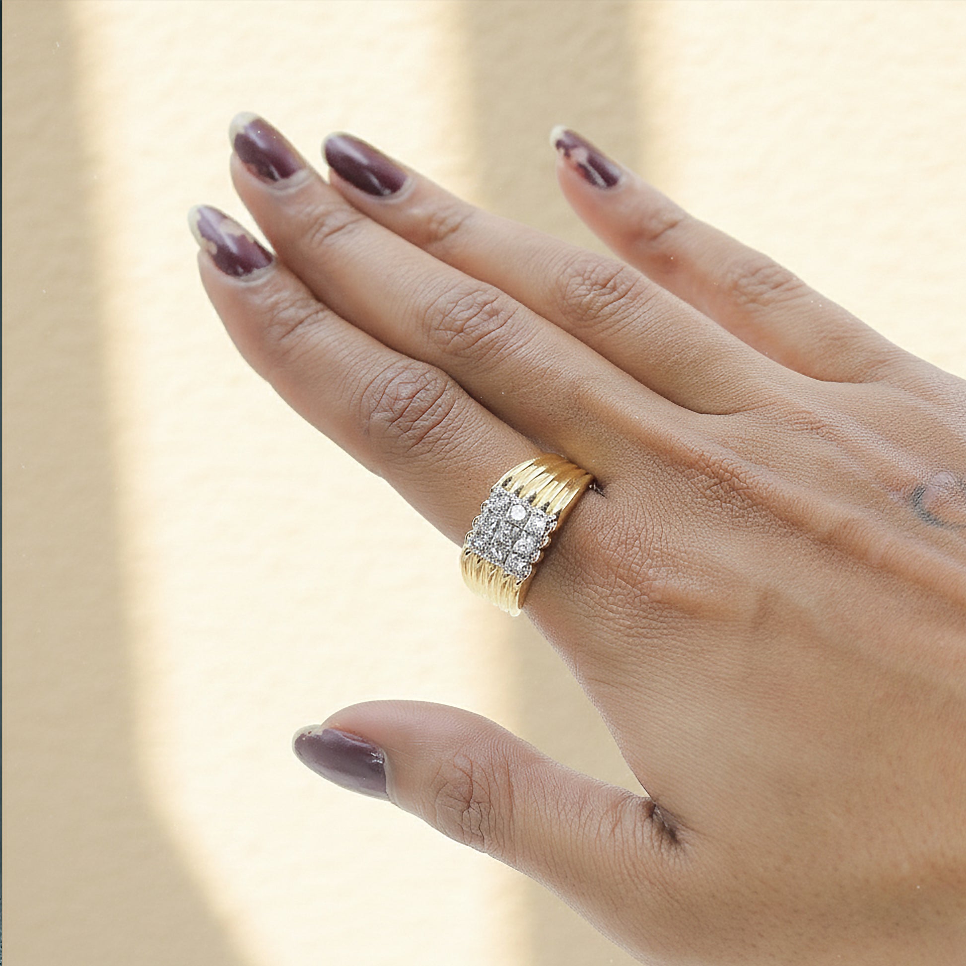 Introducing the luxurious Yellow Gold Multi-Row Diamond Band Ring - AJ60051. This statement piece features a substantial wide band (inferred from image) with a visually striking design of alternating polished gold rows and glittering diamond lines. The ring is set with 9 diamonds which provide a spectacular sparkle and combine for an impressive 4.938 Ct total weight.