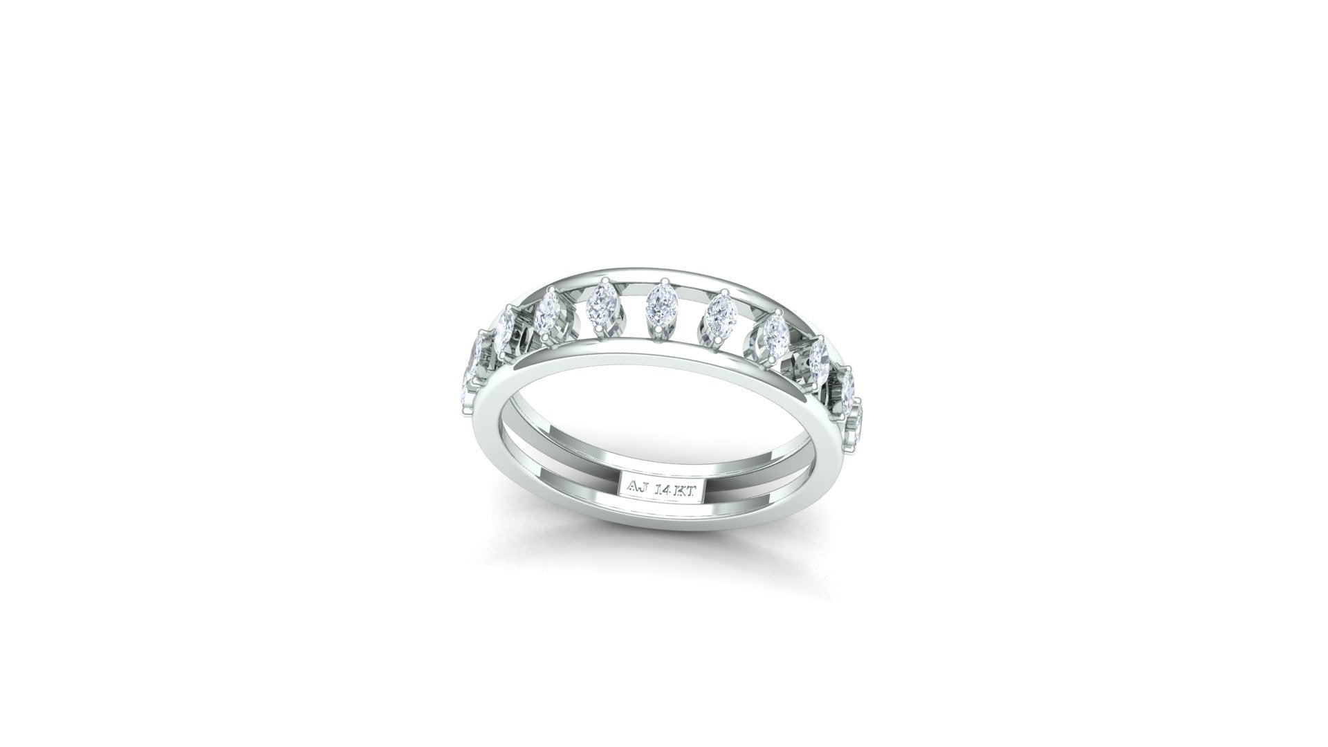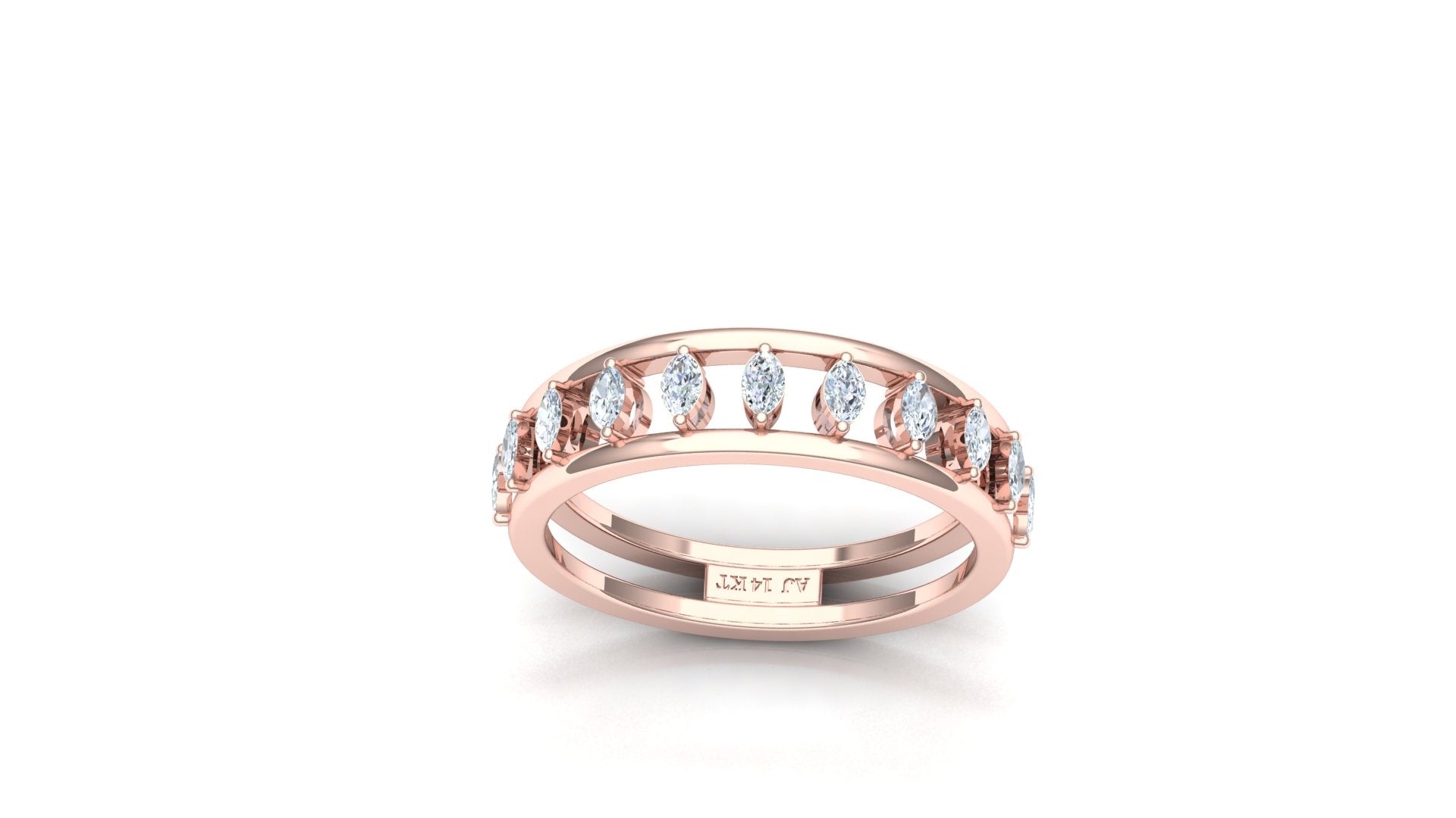 The central design element is a row of 11 small diamonds that are channel-set vertically (inferred) between the gold rails. These diamonds total 0.28 Ct. The orientation of the stones, running perpendicular to the finger, is unique and adds a modern flair to the sparkle.