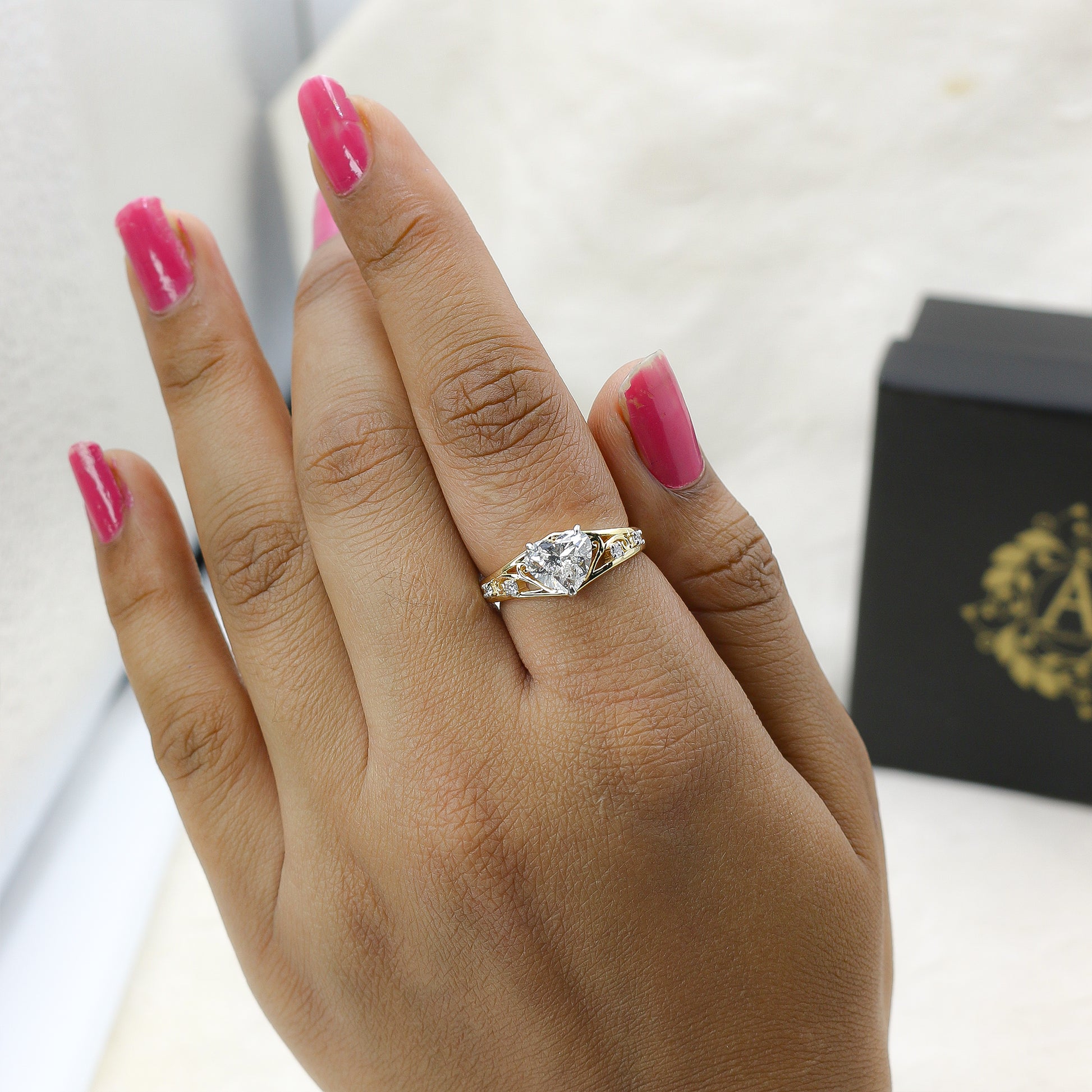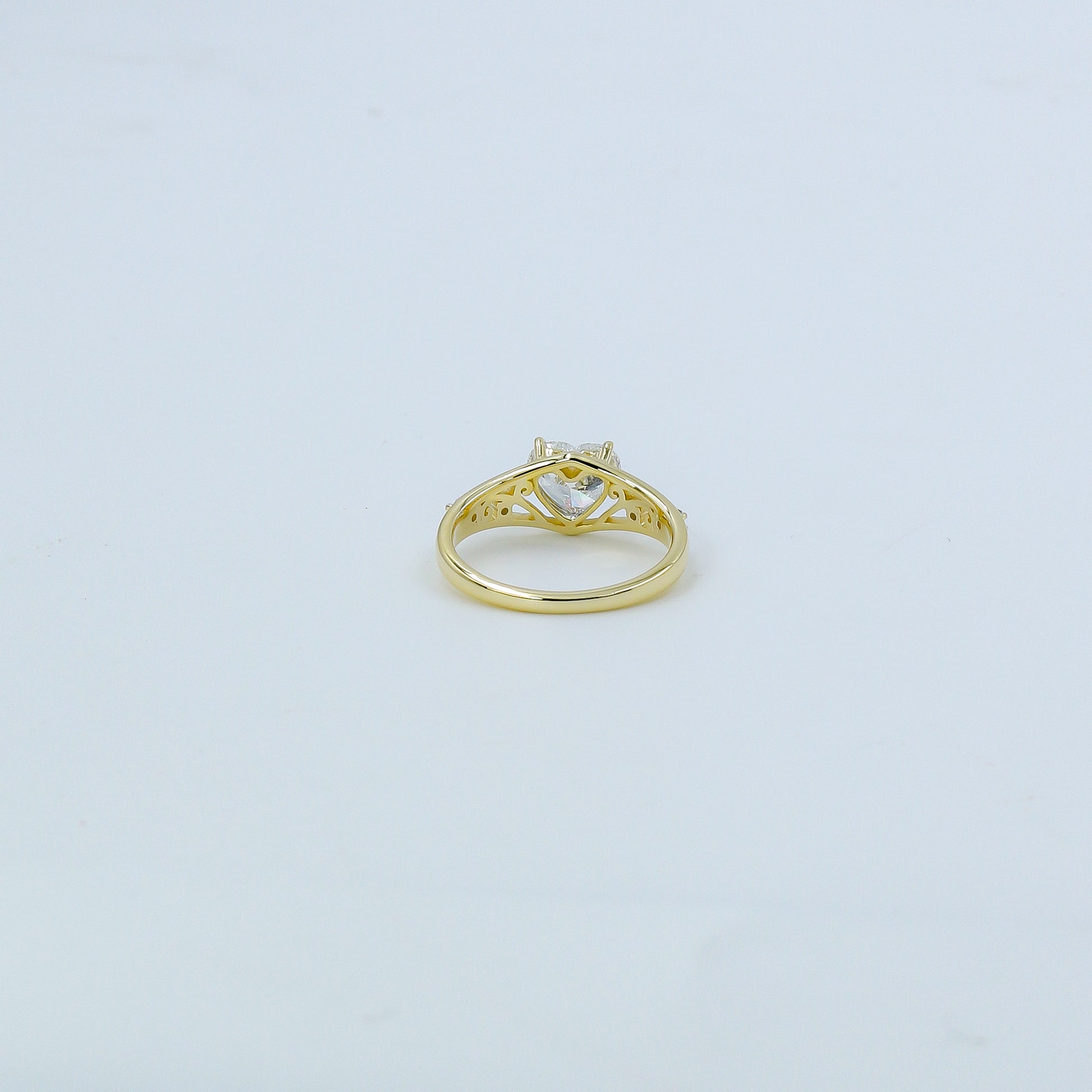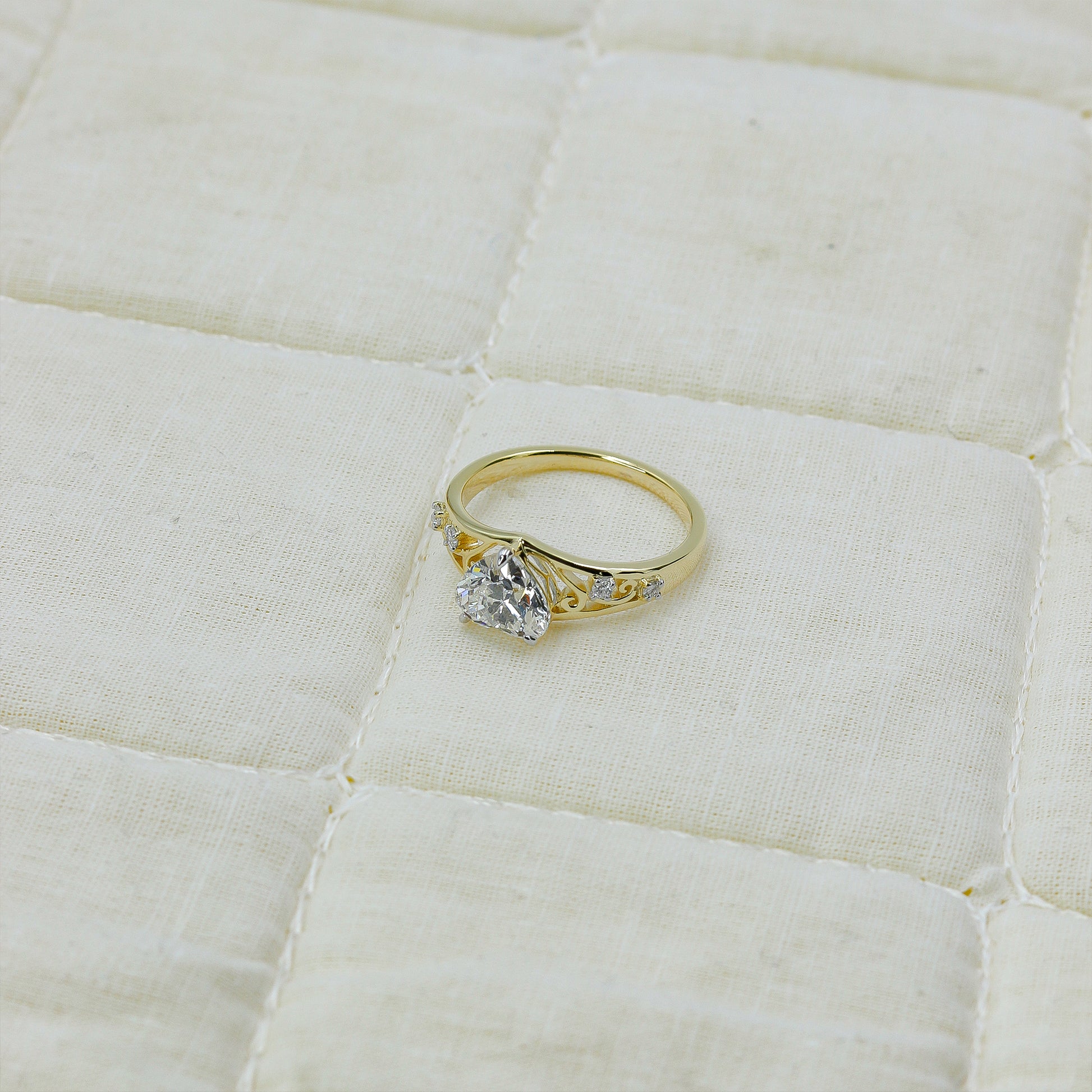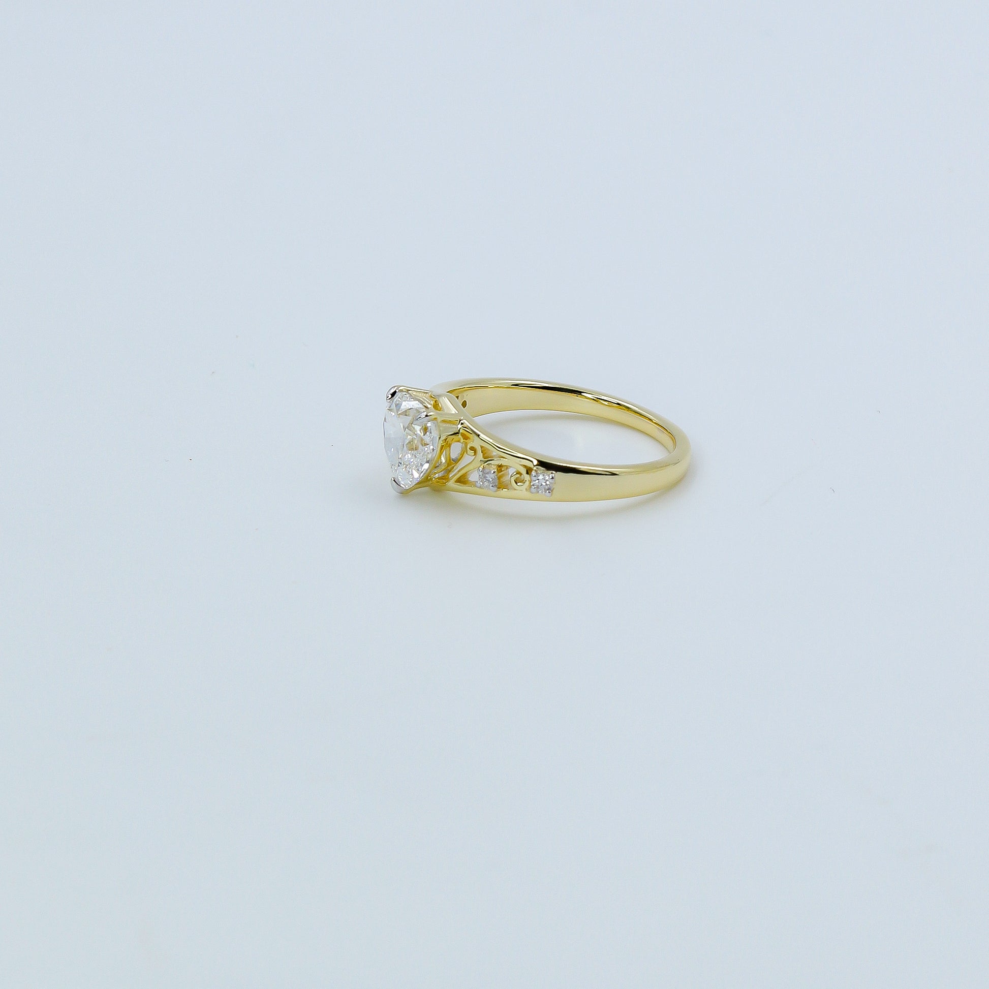 The center stone is showcased on a masterfully crafted yellow gold band featuring delicate openwork filigree and additional diamond accents. The ring features a total of 5 diamonds with a substantial combined weight of 1.50 carats. These premium lab-grown CVD diamonds are rated at D-VVS2 and EF-VVS clarity, ensuring an exceptional colorless sparkle. With a total weight of 3.08 grams, this ring is an ideal choice for a sophisticated engagement or a landmark anniversary gift.