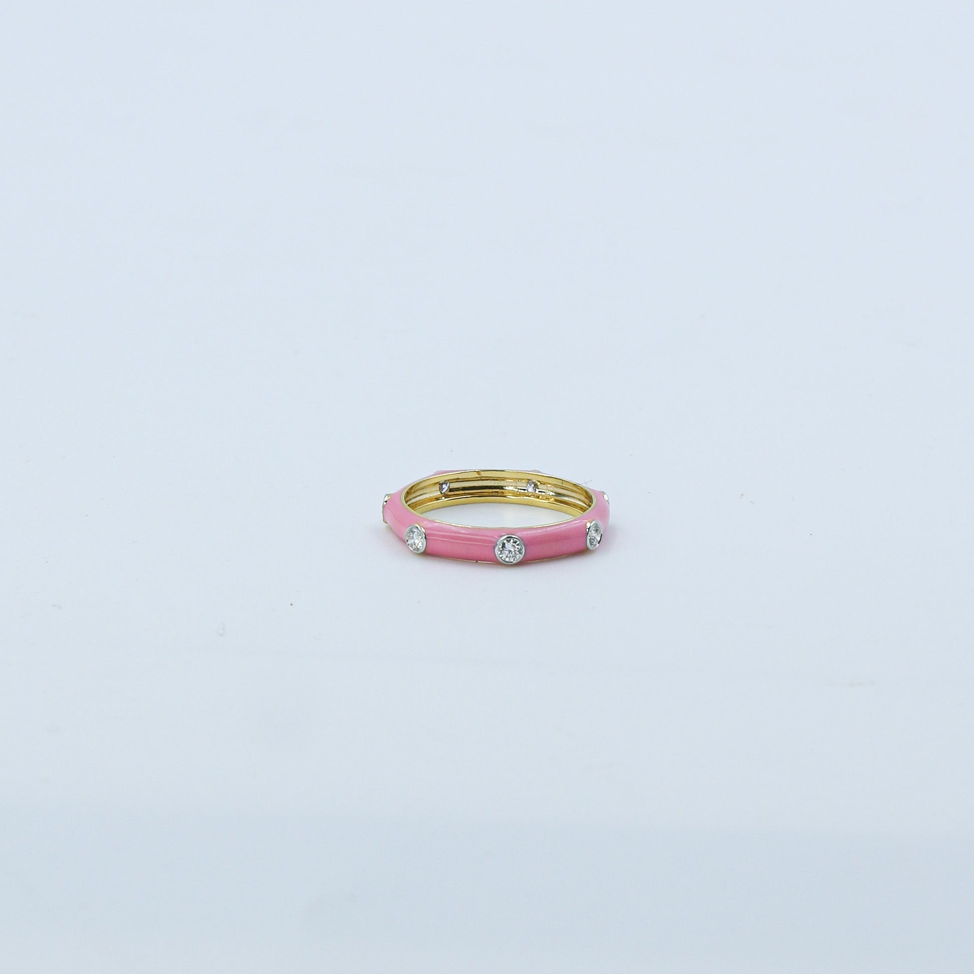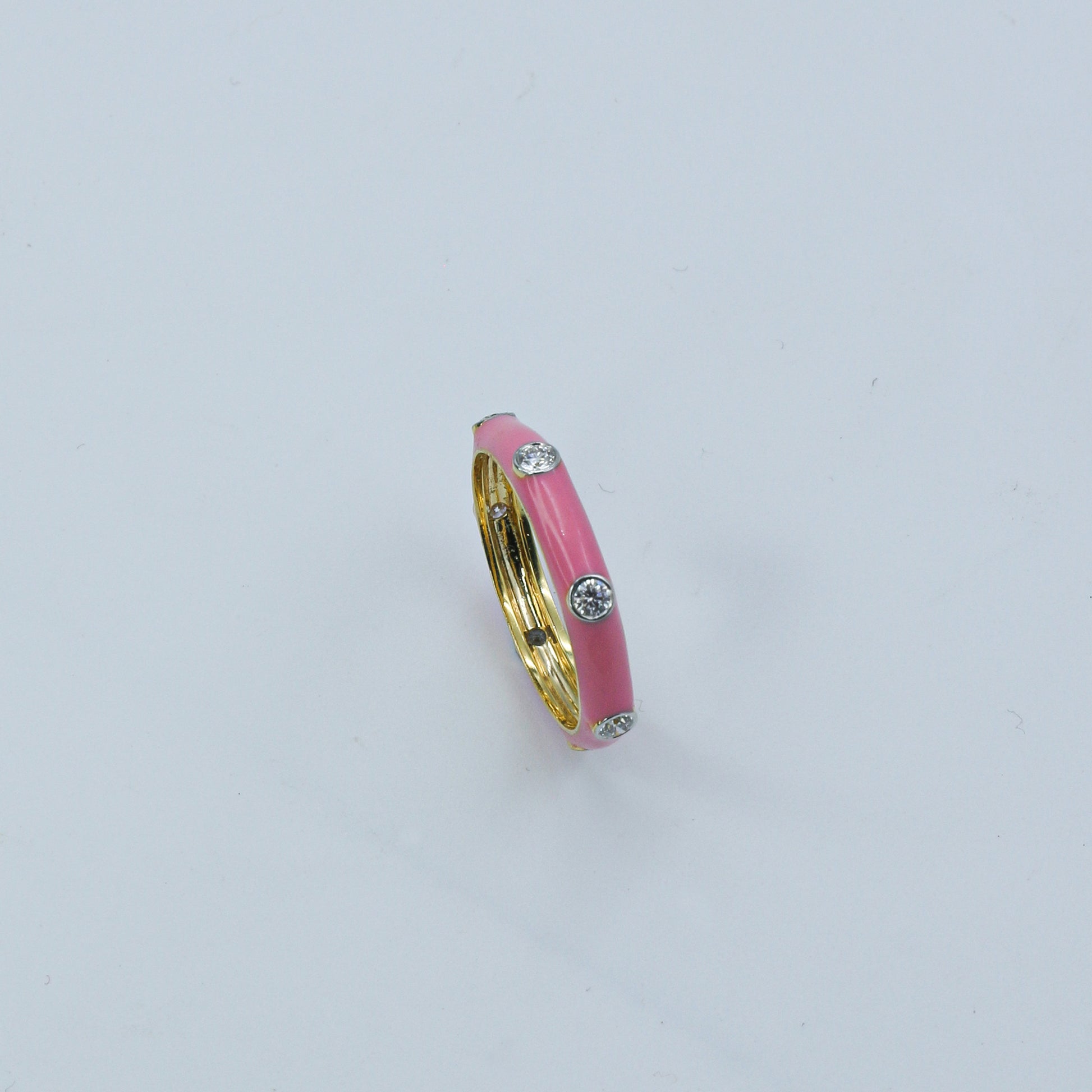 Infuse your jewelry collection with vibrant color and ethical brilliance with the Yellow Gold and Pink Enamel Lab-Grown Diamond Band - AJ61253. This contemporary ring features a smooth, candy-pink enamel inlay that offers a bold and cheerful contrast to the polished yellow gold frame. Set precisely within the enamel are 7 round brilliant-cut lab-grown CVD diamonds, totaling 0.25 carats.