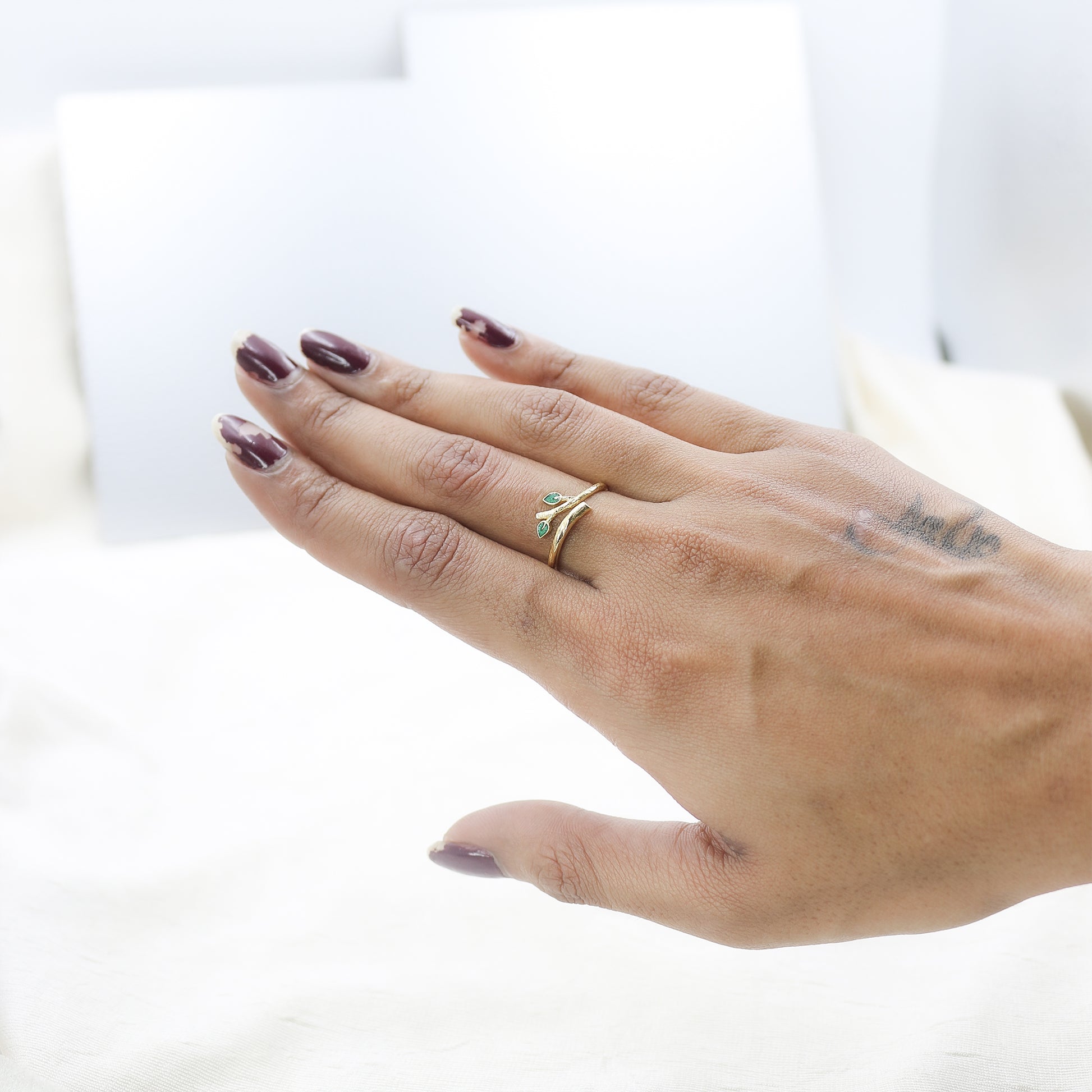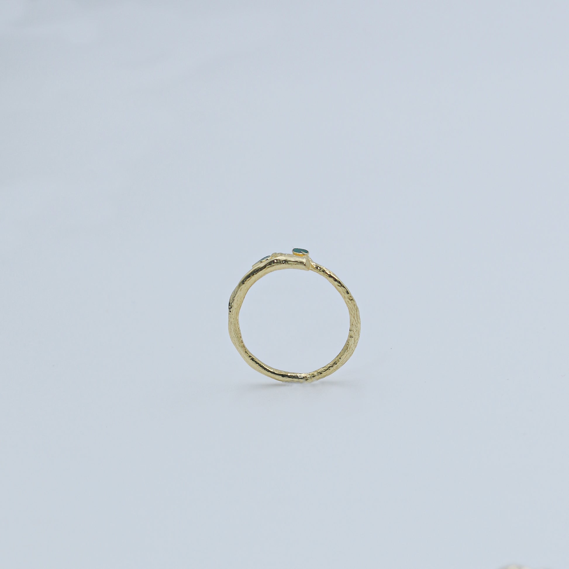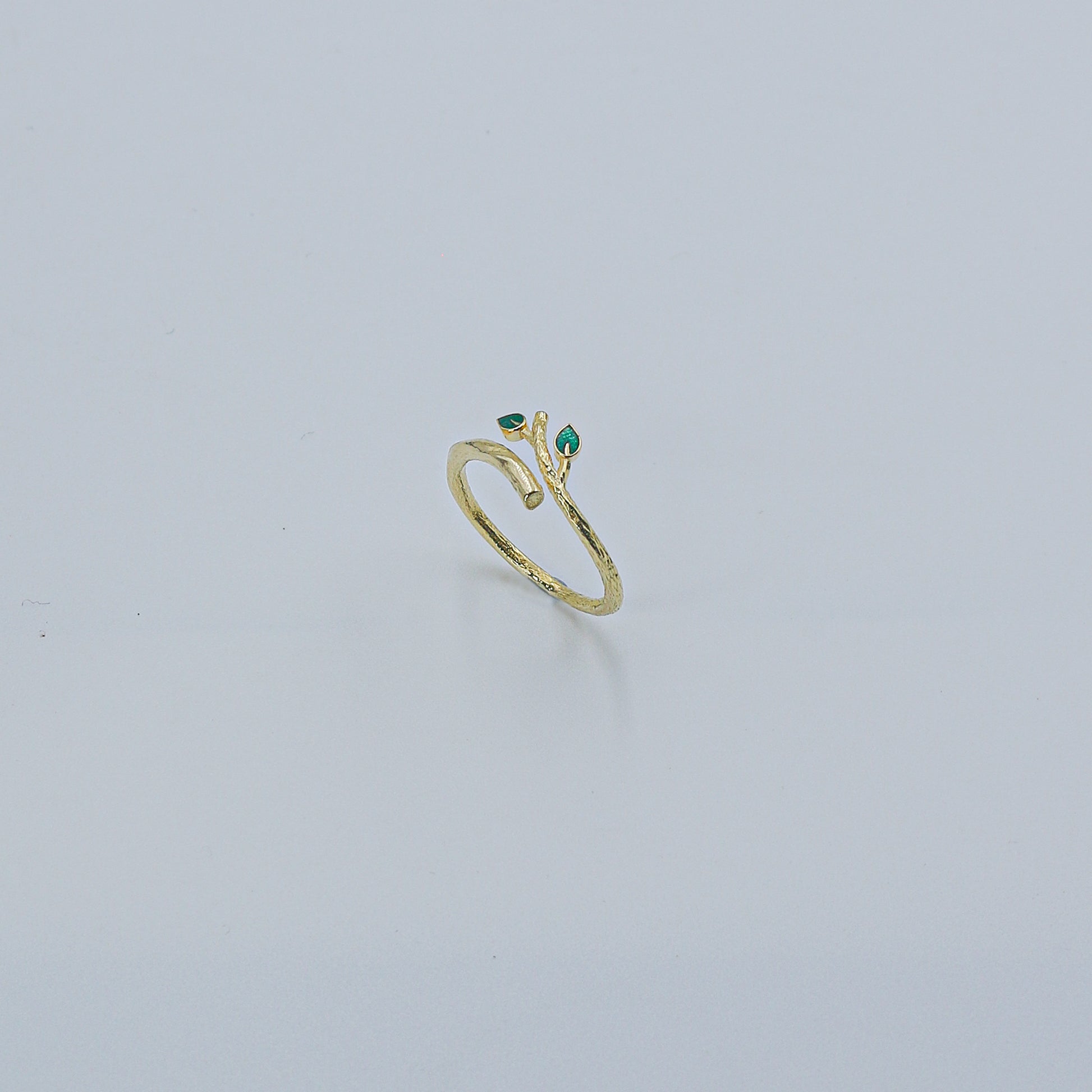 Introducing the charming Yellow Gold Gemstone Accent Bypass Ring - AJ61193. This minimalist ring features a slender band that gracefully curves into an open bypass style. The two ends of the band are delicately set with small, contrasting green gemstones (inferred), adding a subtle pop of color to the polished yellow gold (inferred) setting.